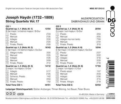 Joseph Haydn CD: Die schönsten Streichquartette Aus der Reihe: Royal Crown Classics Titelliste: Streichquartett op. 1 1 B-Dur (Jagdquartett) 17:31 1. Presto 2. Menuett 1 Menuett 2 3. Adagio 4. Menuett 5. Finale: Presto Streichquartett op. 64 1 C-Dur 19:14 6. Allegro 7. Menuett 8. Scherzando 9. Prest