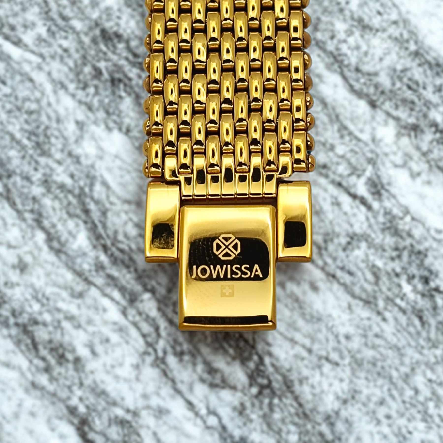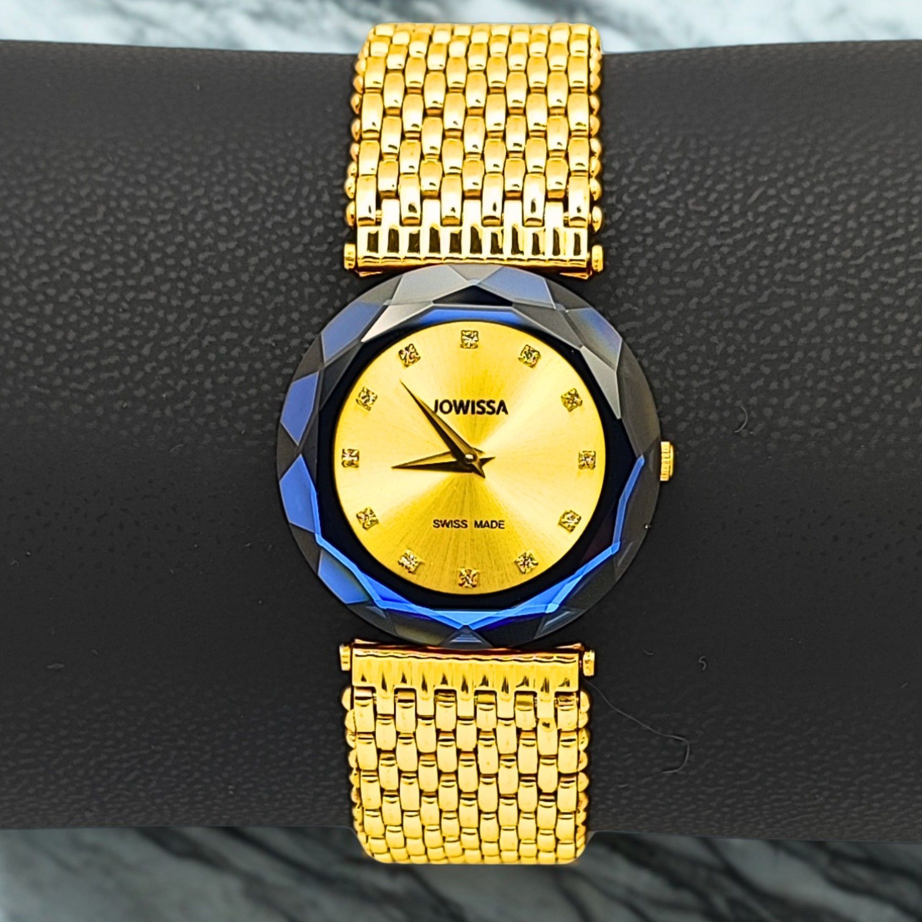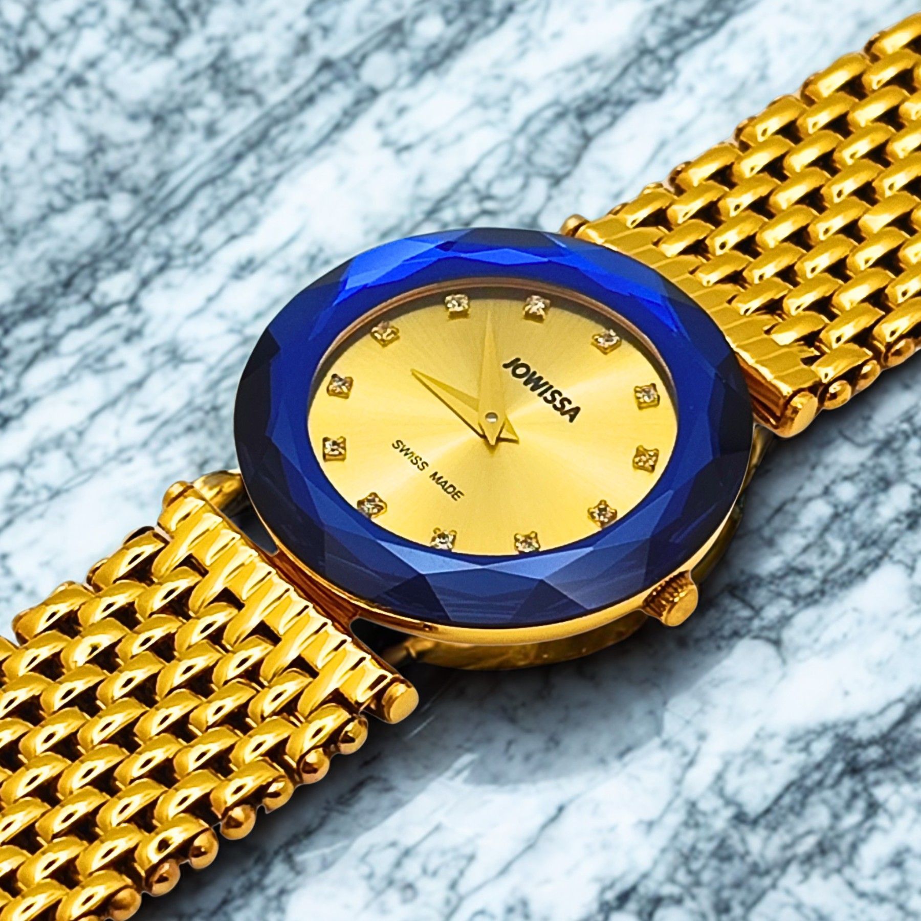 Damenuhr - Diamantschliff Lünette - Strahlende Eleganz in Gold – Jowissa Safira JO.115 Diese Damenuhr von Jowissa kombiniert luxuriöse Ausstrahlung mit Schweizer Präzision. Das goldene Zifferblatt mit funkelnden Indexen wird von einem facettierten blauen Saphirglas eingerahmt, das je nach Lichteinfa