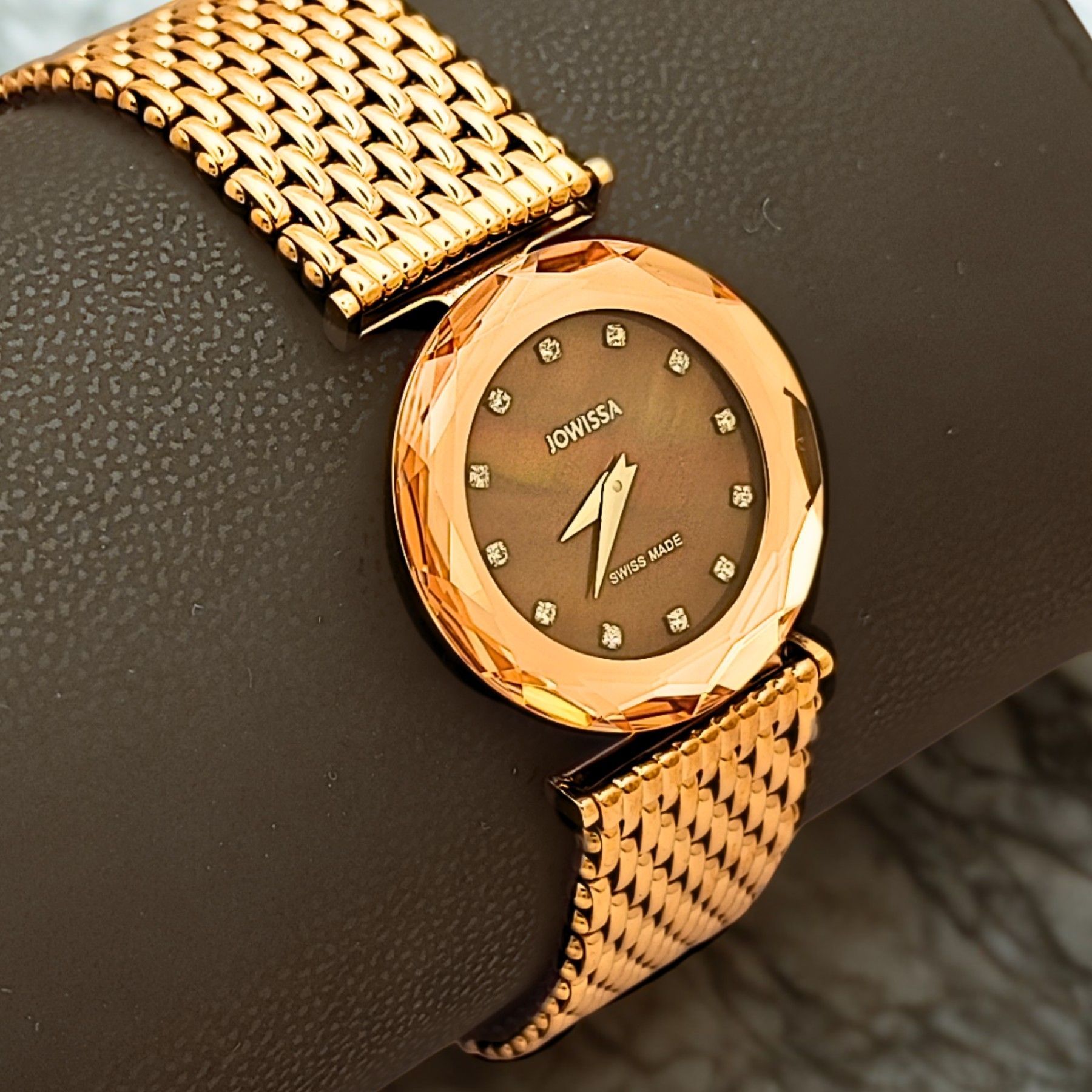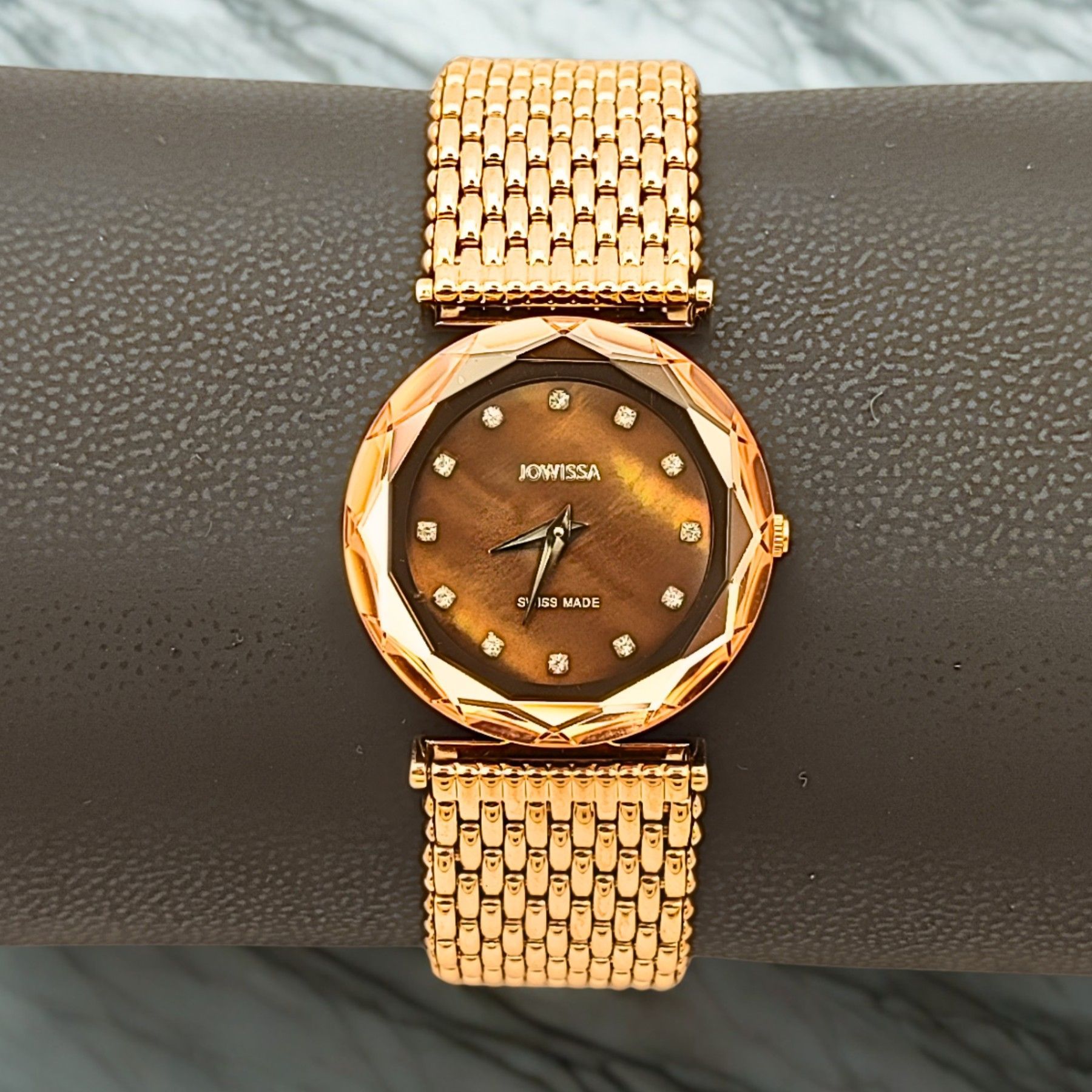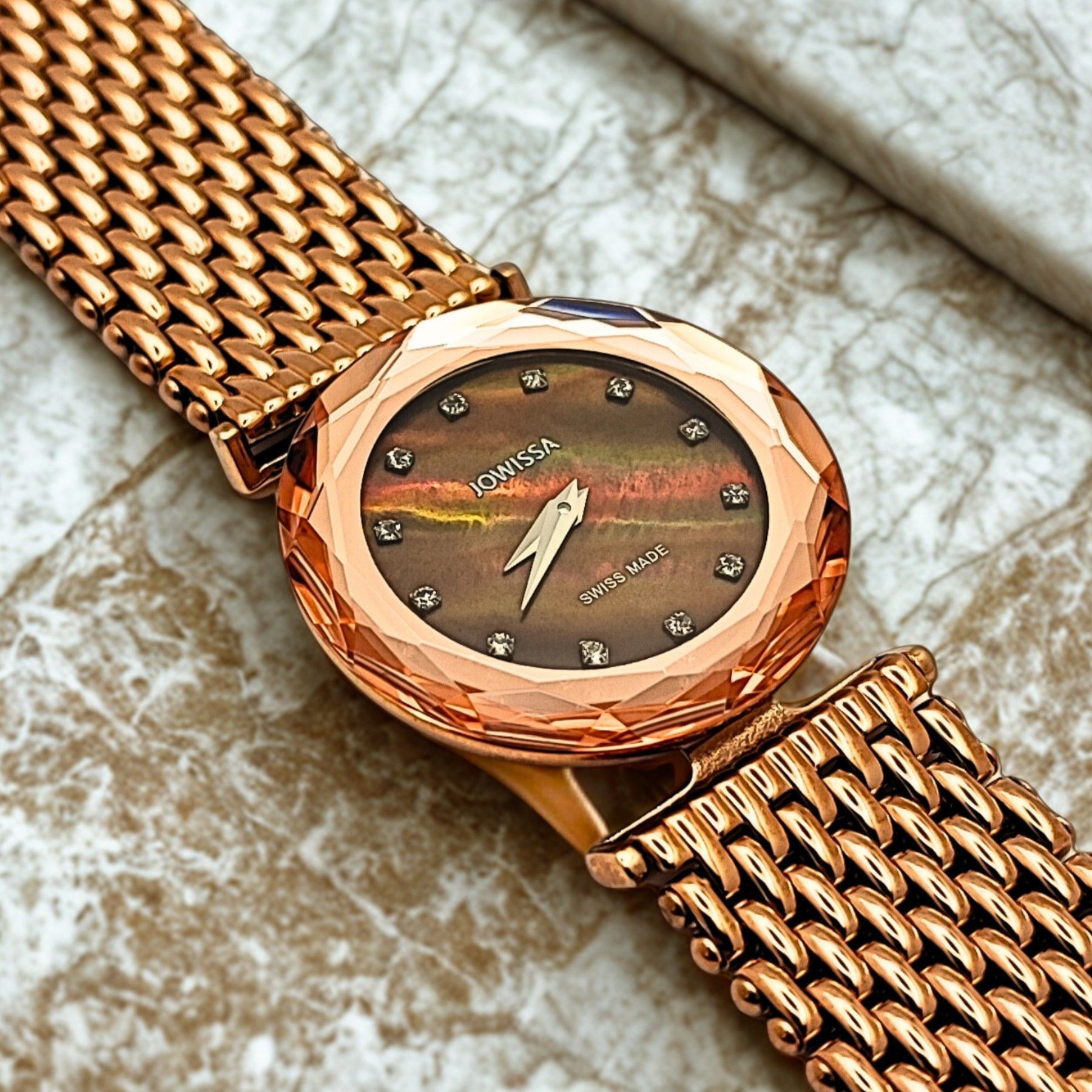 Damenuhr - Diamantschliff Lünette - Jowissa Safira JO.045 – Edle Eleganz in Roségold Diese Damenuhr von Jowissa ist ein echtes Highlight für Liebhaberinnen stilvoller Accessoires. Das roségoldene Gehäuse und Armband verleihen ihr eine warme, luxuriöse Ausstrahlung. Das schimmernde Zifferblatt in Bra