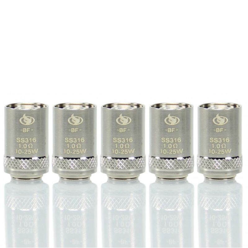 Joyetech InnoCigs BF SS316 Verdampferköpfe mit Edelstahlwicklungen aus SS316 für Mund- (MTL), bzw. Lungeninhalation (DL) im 5er Pack. - Wicklung Typ: SS316 Edelstahl, vertikale Anordnung - geeignet für Watt- und Temperaturgeregeltes Dampfen - Widerstände und Leistungsbereiche: 1,0 Ohm Head (MTL) - 1