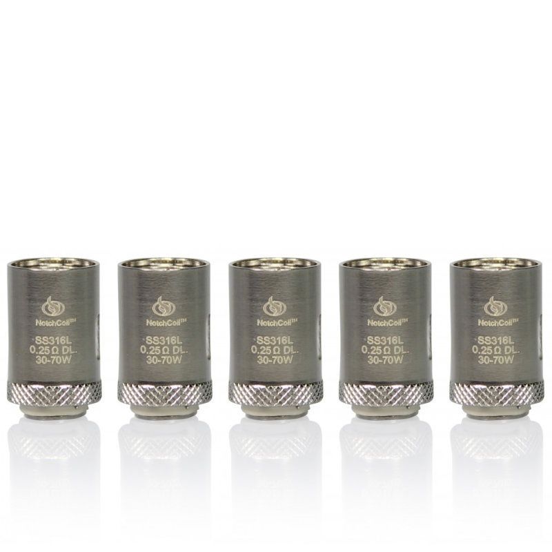 Joyetech InnoCigs Notch Coil Verdampferköpfe mit Edelstahlröhre (NotchCoil) für die Lungeninhalation (DL) im 5er Pack. - Wicklung Typ: Edelstahl-Notch Coil, vertikale Anordnung - Widerstand: 0,25 Ohm - Leistungsbereich: 30-70W
