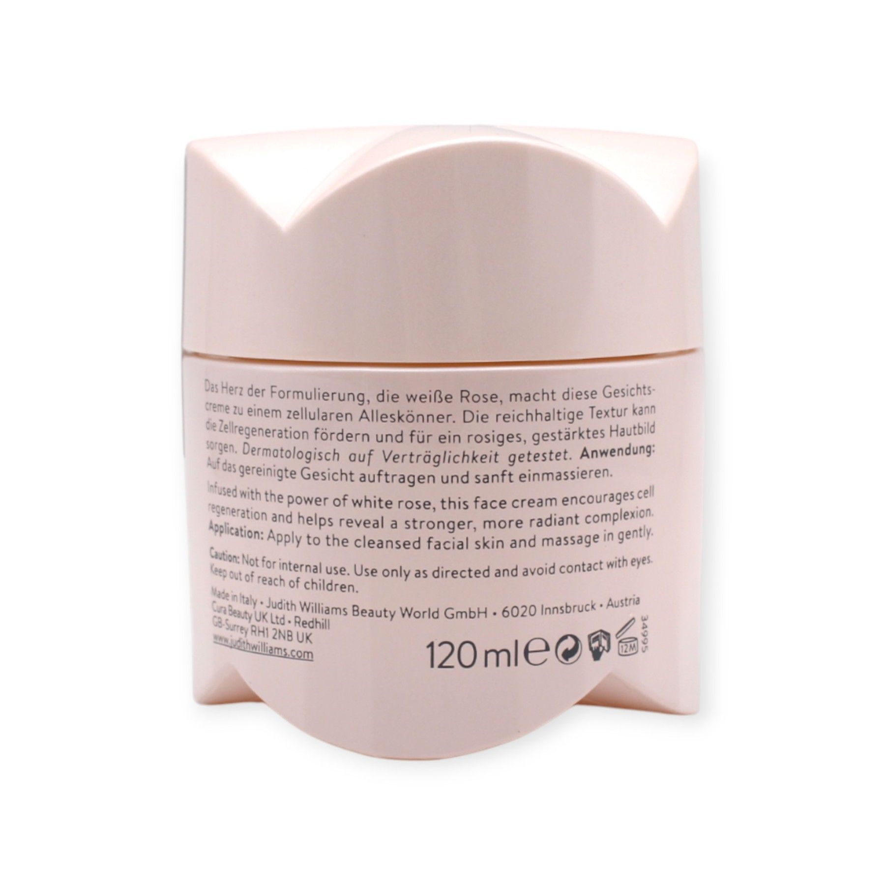 Judith Williams Judith Williams Life Long Beauty White Rose Face Cream, 120 ml Die Rich White Rose Face Cream ist eine luxuriöse Pflege, die sich perfekt an den natürlichen Biorhythmus der Haut anpasst. Sie unterstützt die Regeneration bei Nacht und bietet Schutz am Tag – für eine rundum gepfl