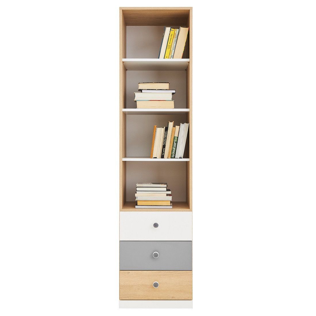Jugendzimmer Phil Set E Lieferumfang: Zum Jugendzimmer Phil Set E gehören : 1. Eckschrank 2. Geschlossenes Standregal 3. Offenes Standregal 4. Schreibtisch 125 5. Kommode 6. Wandregal 120 7. Bett 200 x 90 120cm Farbe : Eiche Weiß Grau Material : Laminierte Spanplatte mit ABS-Kanten Set D - Details: