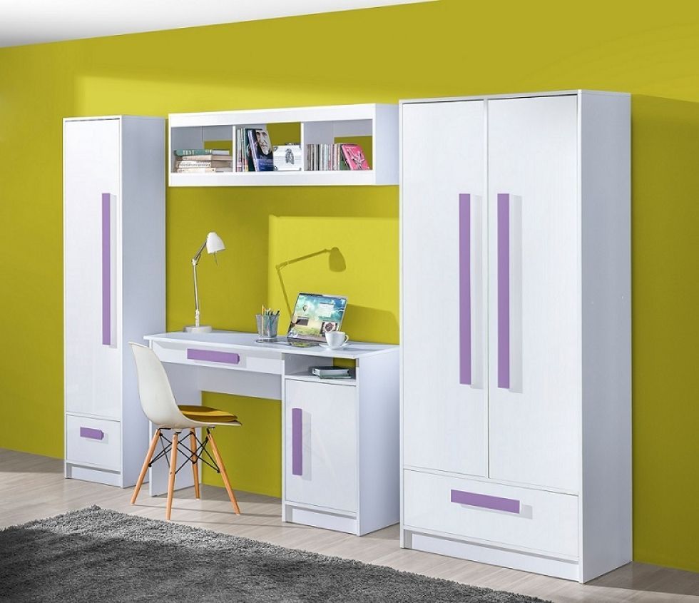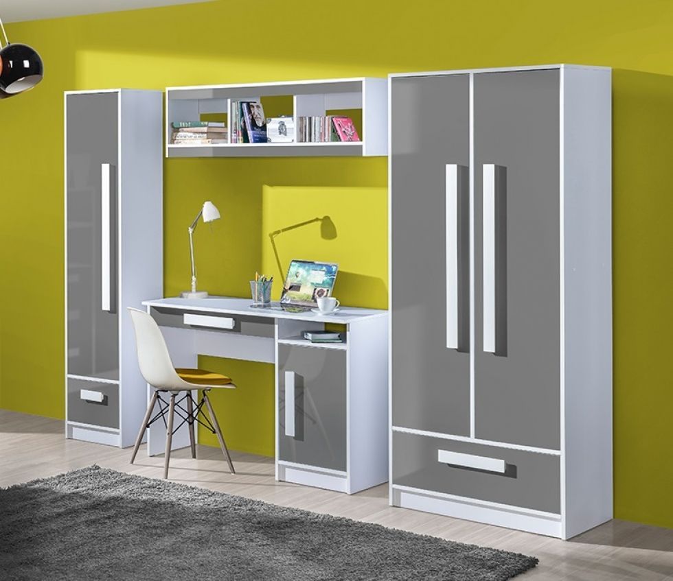Jugendzimmer komplett Gerome Set A Lieferumfang: Zum Jugendzimmer Set A gehören: 1. Schrank 2-türig 2. Standregal 40 3. Schreibtisch 120 4. Wandregal 120 Farben : - Korpus: Weiss - Fronten hochglanz wählbar:: Weiß Rosa Aschgrau Türkis Achtung: Fronten in Grün sind nicht mehr erhältlich - Griffe wähl