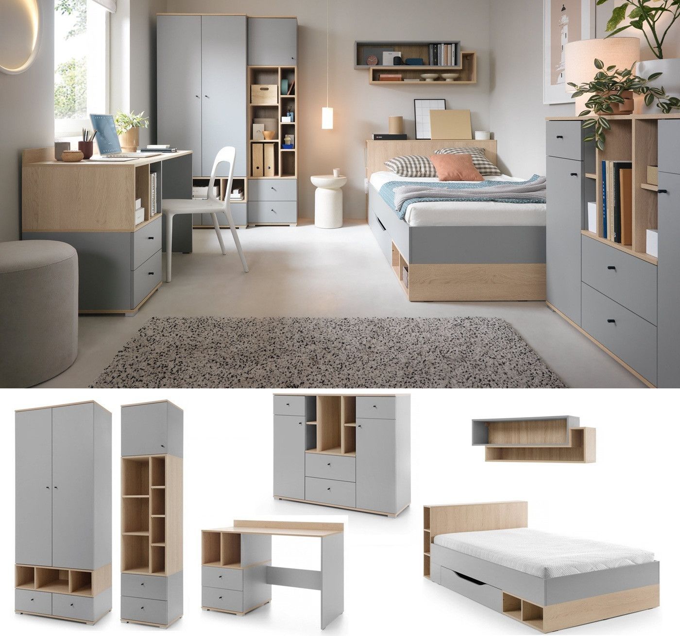 Jugendzimmer Oriel Set B Lieferumfang: Zum Jugendzimmer Oriel Set B gehören: 1. Schrank 2-türig 2. Regal R3 3. Kommode 120 4. Schreibtisch 120 5. Wandregal 115 6. Bett 120x200 Farbe: - Korpus & Fronten: Platingrau Biskuit-Eiche - Griffe: Schwarz Material: - Laminierte Spanplatte mit ABS-Kanten -