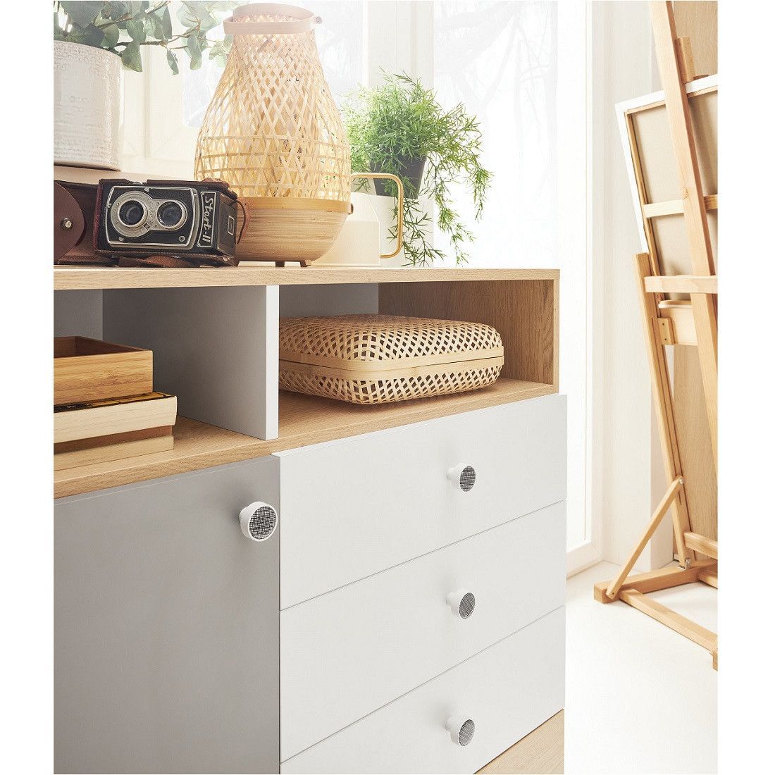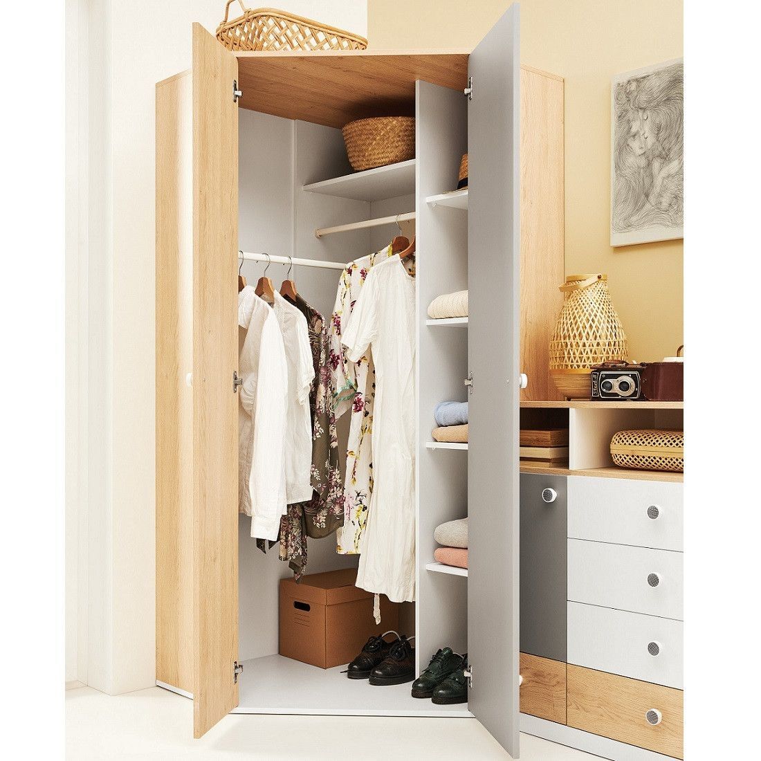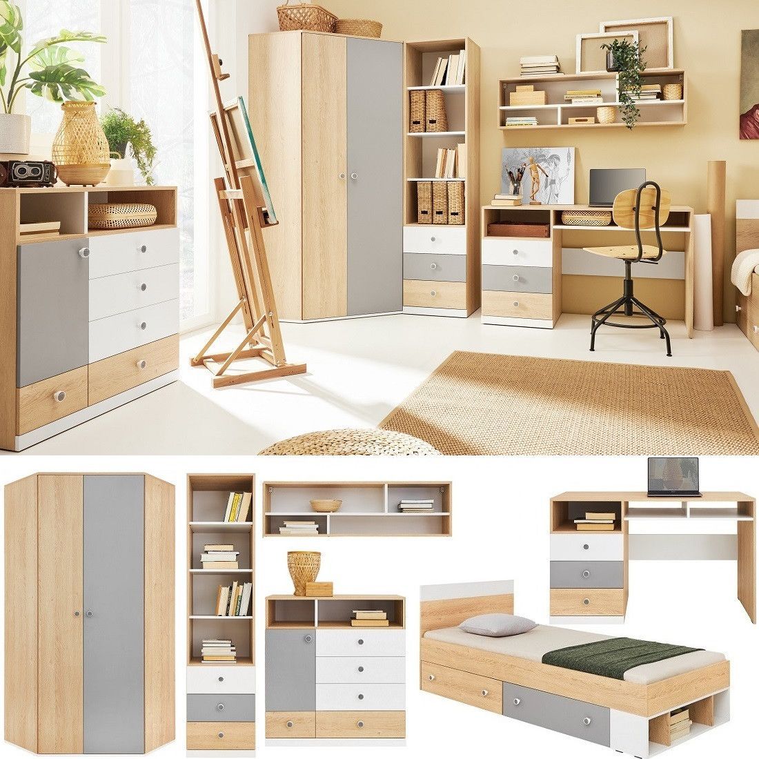 Jugendzimmer Phil Set B mit optionalem Bett Lieferumfang: Zum Jugendzimmer Phil Set B gehören : 1. Eckschrank 2. Standregal P6 3. Schreibtisch 125 4. Kommode 5. Wandregal 120 optional bestellbar: 6. Bett 200 x 90 120cm Farbe : Eiche Weiß Grau Material : Laminierte Spanplatte mit ABS-Kanten Set B - D