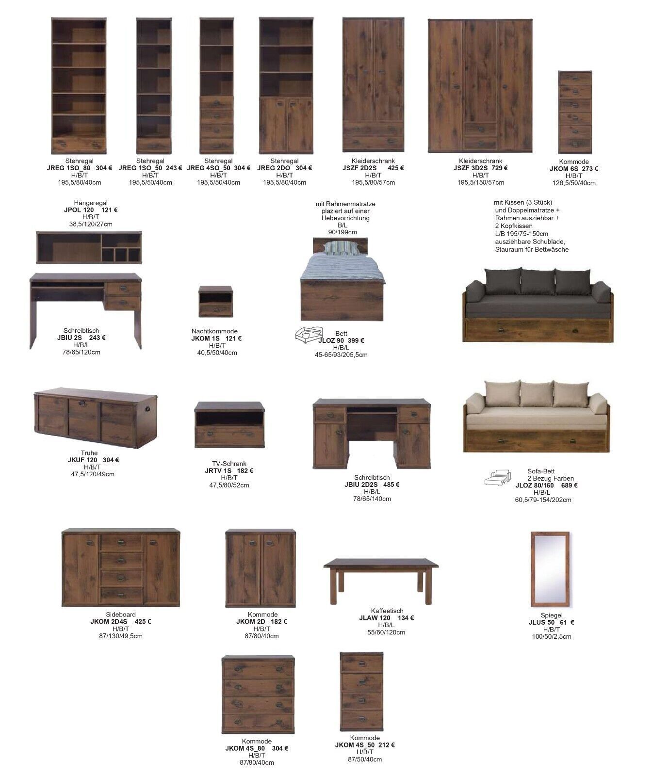 Modulsystem Jugendzimmer Kinderzimmer INDIANA 2 NEU & Schnell Eiche Sutter Nachbildung Gute Qualität ! Messing Griffe und Ecken Der Preis versteht sich ohne Stuhl und Dekoration. Außenmaße und Lieferumfang: 3 x H ä ngregal JPOL 120: H: 38,5 cm B: 120 cm T: 27 cm Schreibtisch JBIU 2D2S: H: 78 cm