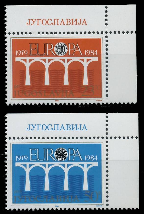 JUGOSLAWIEN 1984 Nr 2046-2047 postfrisch ECKE-ORE Europa Gemeinschaftsausgaben CEPT 1984 0.82€ incl. MwSt: Differenzbesteuert zzgl. Versandkosten Bestell-Nr.: 5B9582 Katalog-Nr: MICHEL (2046 - 2047) Katalogpreis: 1,50 EUR Qualität: Normal Erhaltung: Postfrisch ** Einheit: Satz Bogenlage: Ecke o