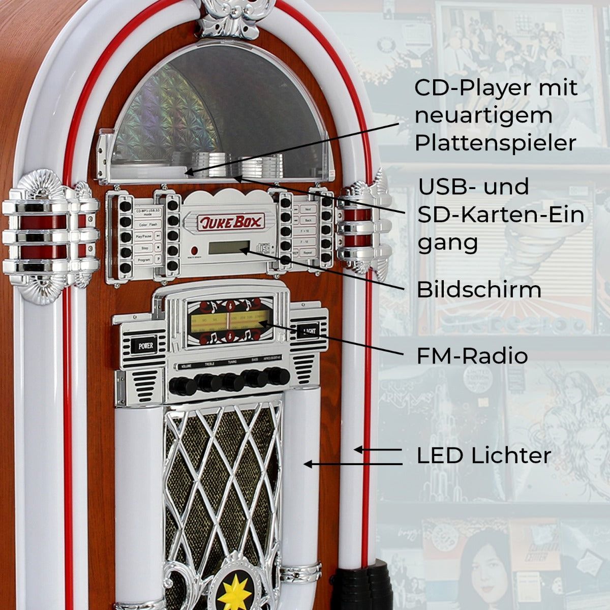 Jukebox Retro 50er Jahre Stil Holz-Gehäuse mit LED-Beleuchtung Fernbedienung