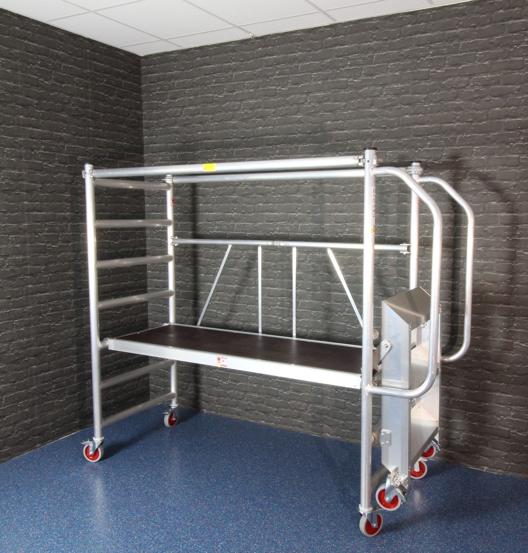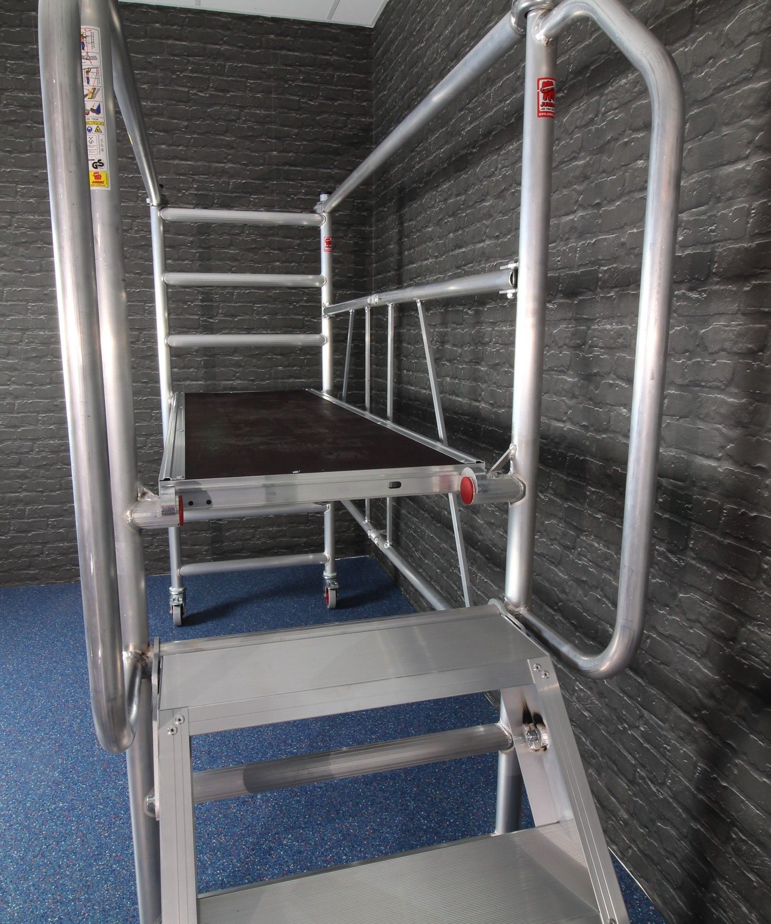 JUMBO Rollgerüst Zimmergerüst mit integrierter Aufstiegs-Treppe und Geländer , Gerüstgruppe 3 bis 200 kg m ² Flächenbelastung, DIN EN 1004 & 1298, TÜV GS. Die sichere und praktische Lösung für Arbeiten, bei denen das Rollgerüst häufig verlassen werden muss! Das JUMBO 178SKT Gerüst ist eine