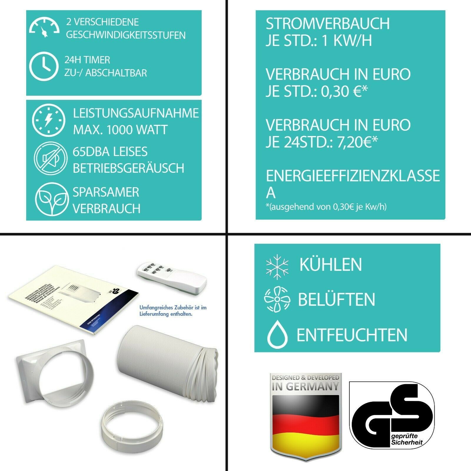 9000 BTU - 1000 W Leistung - EEK A - mit Abluftschlauch