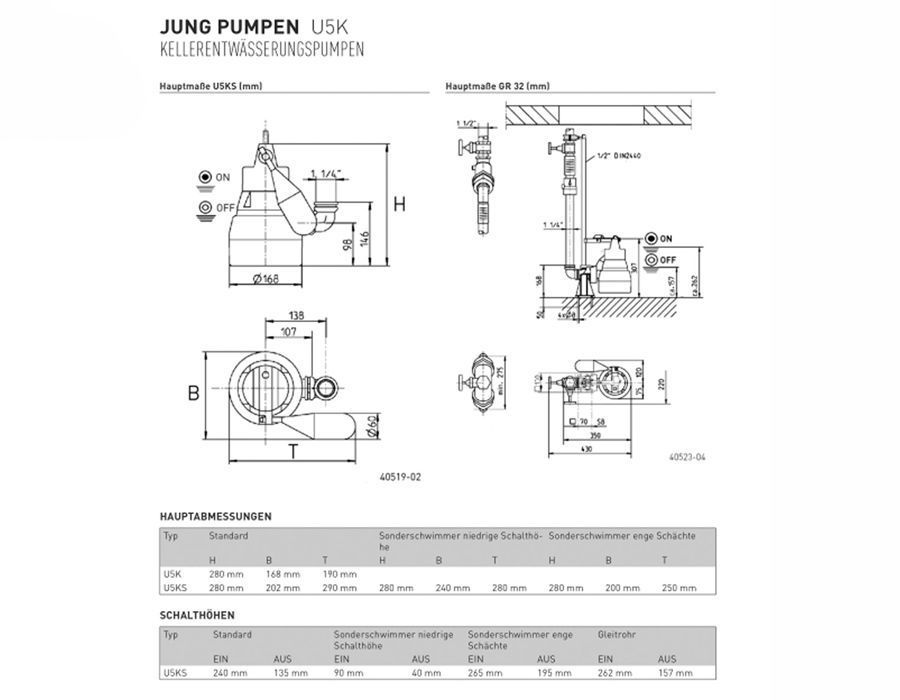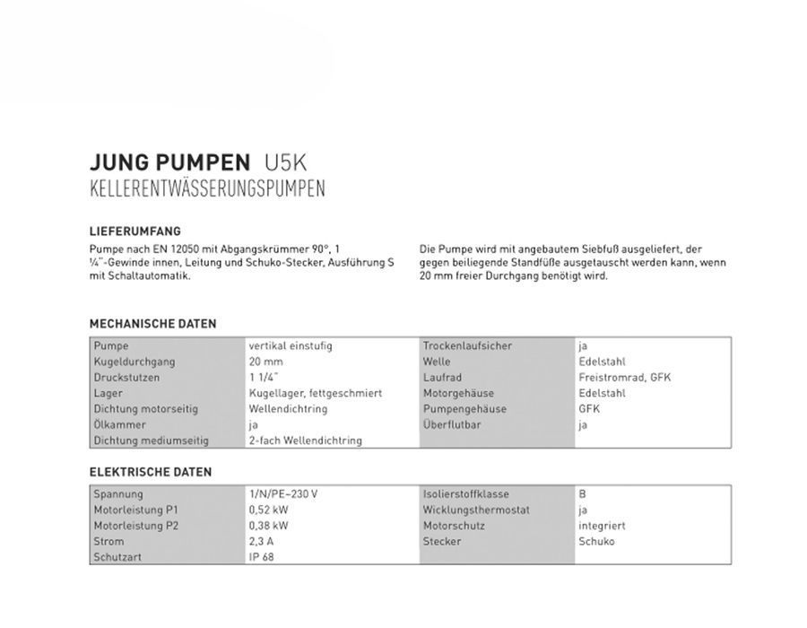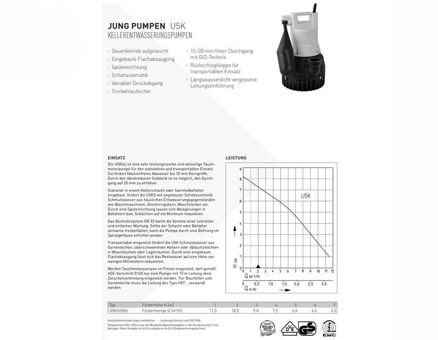 Jung Tauchpumpe U5 KS 230V 10 m Drainagepumpe Schmutzwasserpumpe Schachtpumpe
