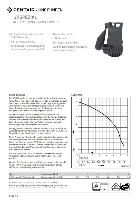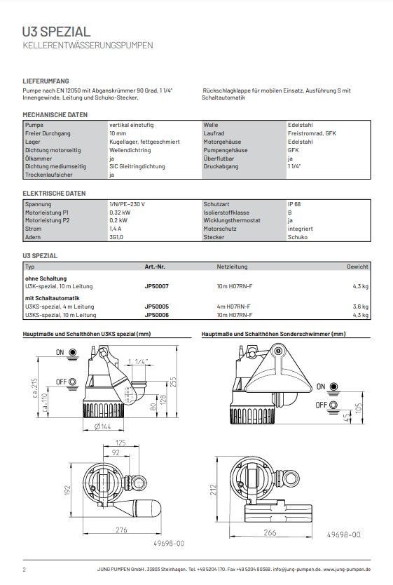 Jung U3 KS Spezial Tauchpumpe 230V 4 m Schmutzwasserpumpe Abwasserpumpe JP50005
