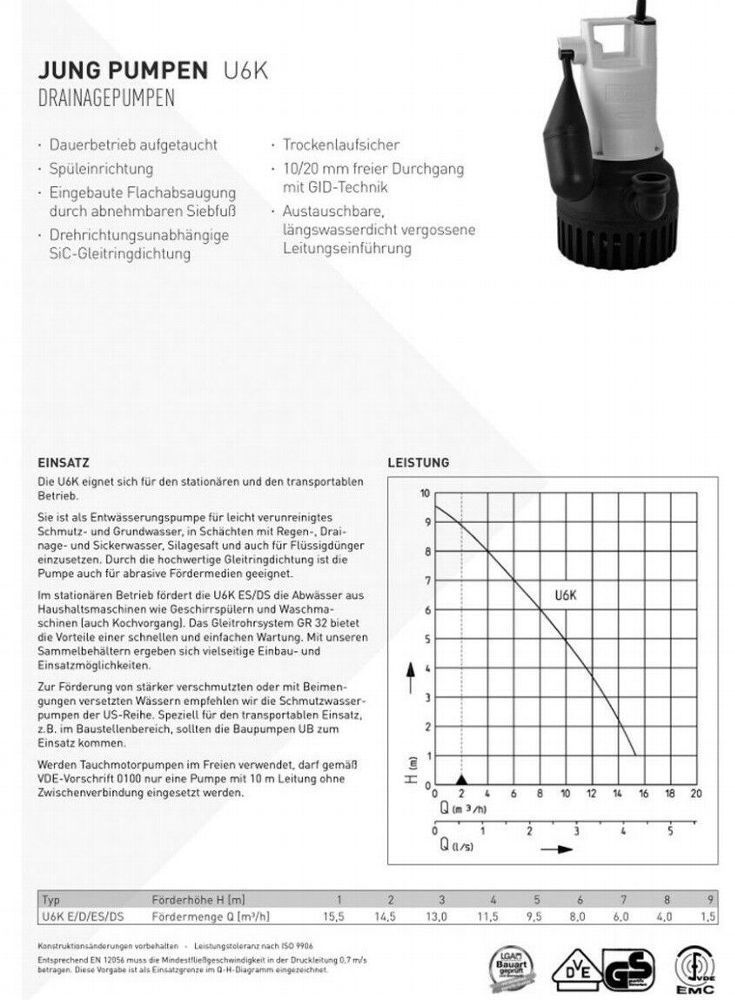 Jung U6 K E Tauchpumpe 230V 10 m Schmutzwasserpumpe Abwasserpumpe Drainagepumpe