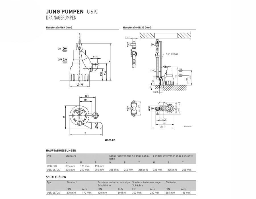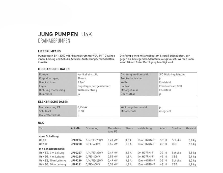 Jung U6 K ES Tauchpumpe 230V 4 m Schmutzwasserpumpe Abwasserpumpe Drainagepumpe