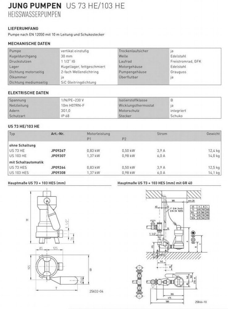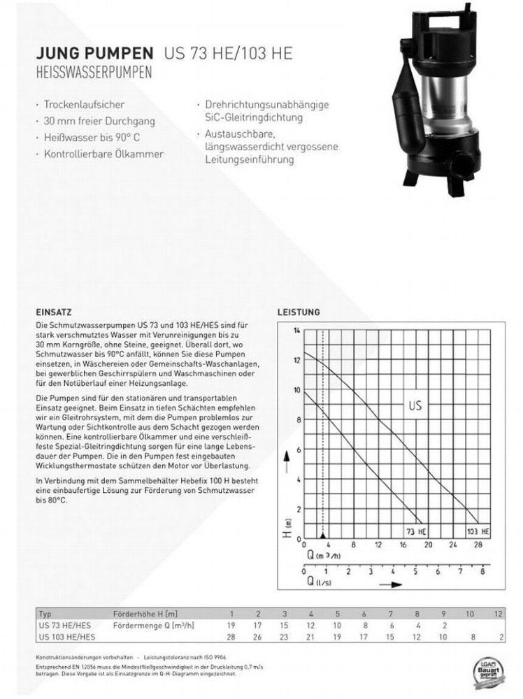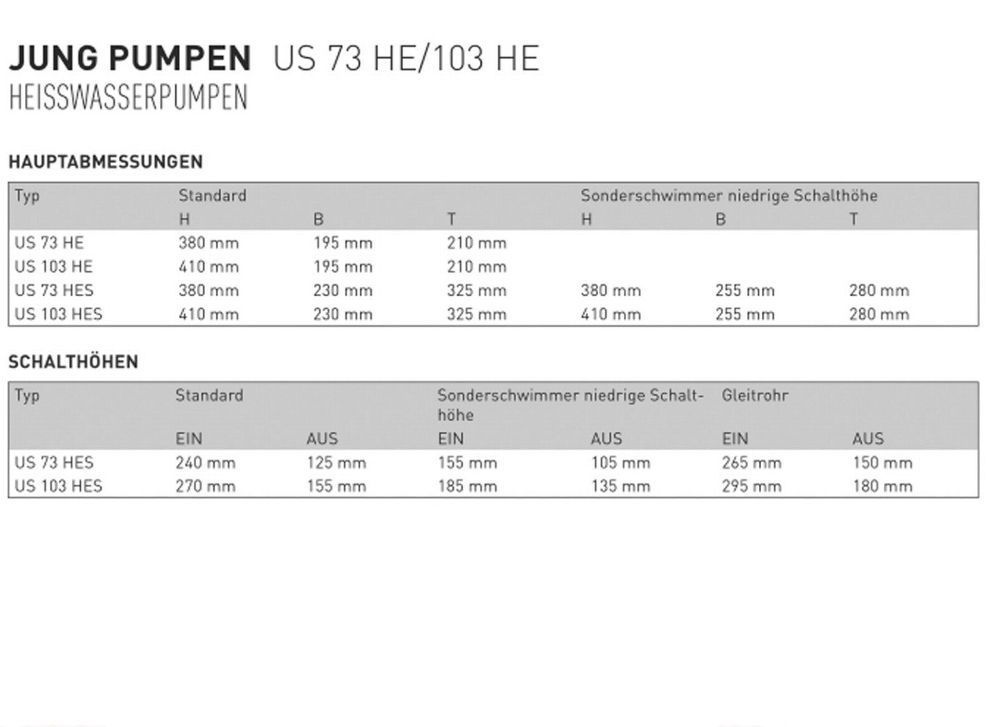 Jung US 73 HES Tauchpumpe 230V 10m Abwasserpumpe Heisswasser Schwimmbecken Pumpe
