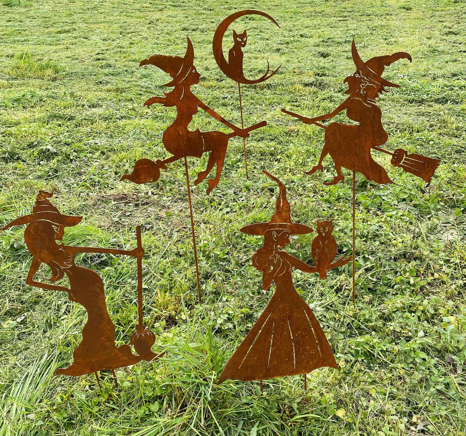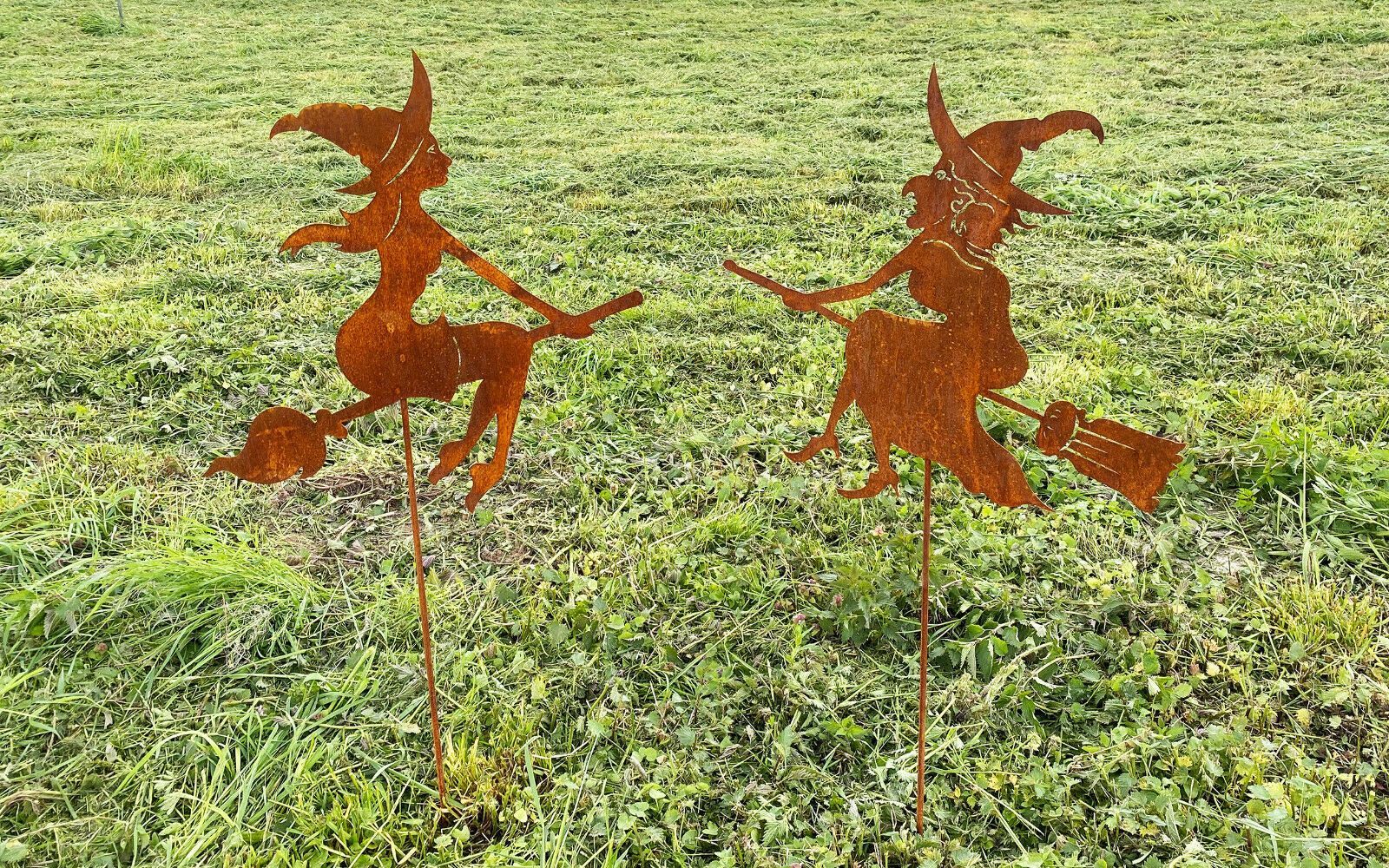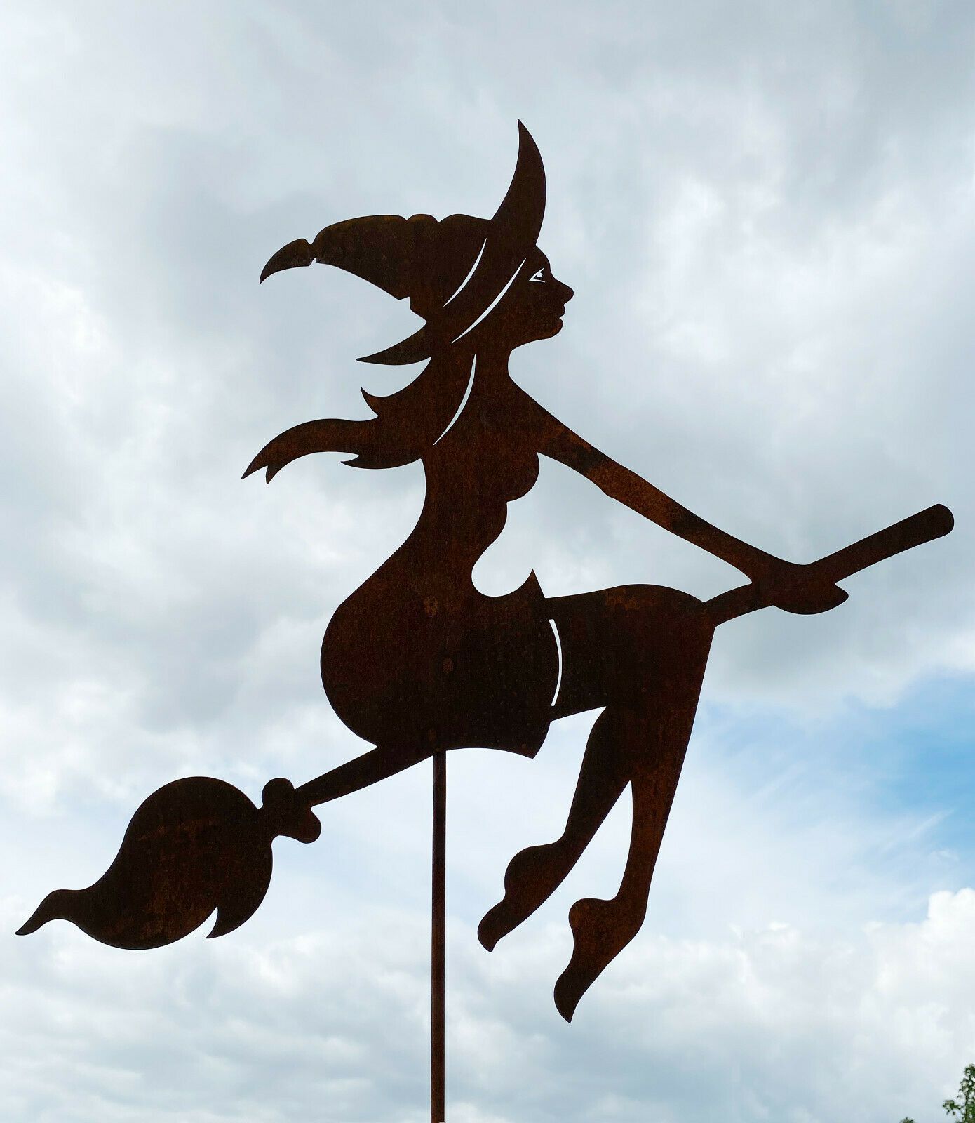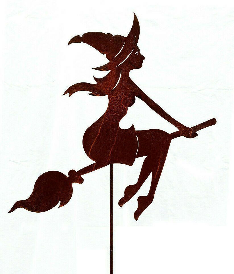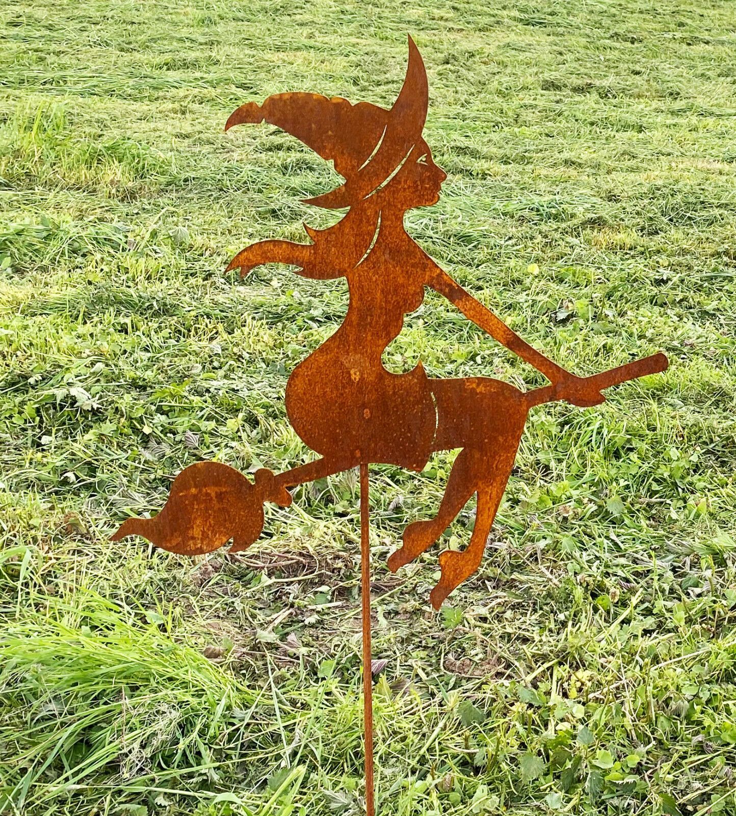 Junge Hexe auf Besen fliegend 30x29cm + Stab Edelrost Gartenstecker Rost Metall