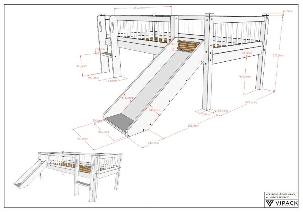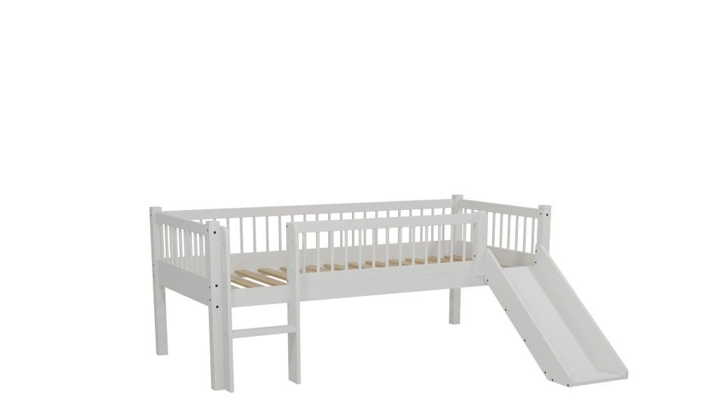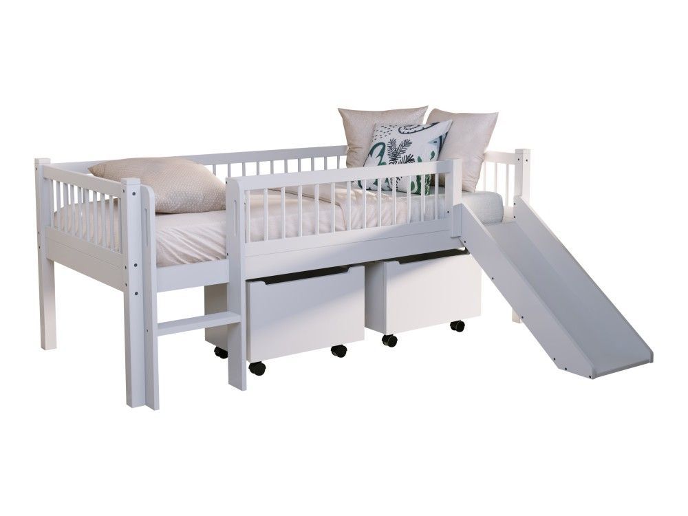 VIPACK Junior-Spielbett Höhe 85 Leiter Rutsche Box Lattenrost 90x200 Buche massiv weiß