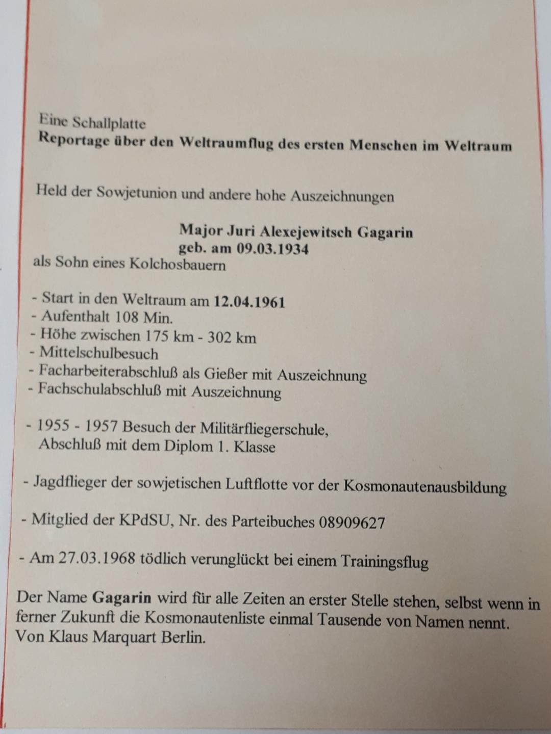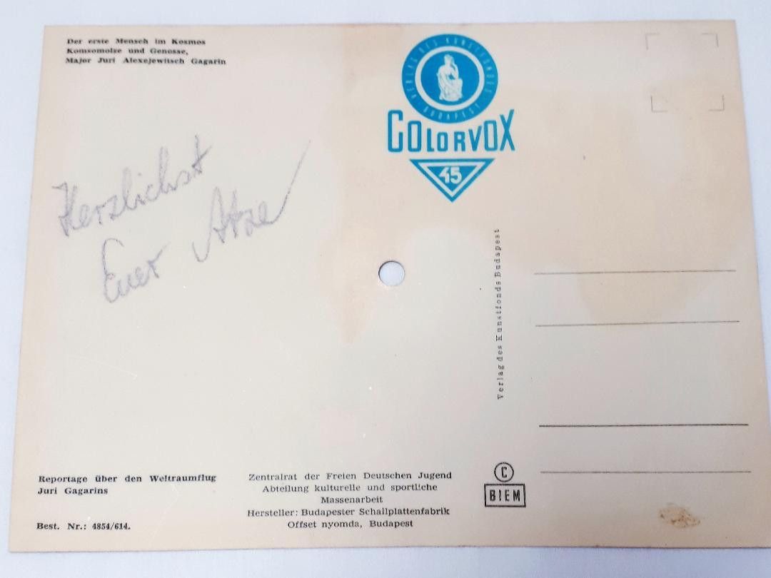 Juri Gagarin Der erste Mensch im Kosmos Colorvox Vinyl * Reportage über den Weltraumflug Juri Gagarins * Hersteller: Budapester Schallplattenfabrik Zustand: gut - gebraucht mit kleinen Gebrauchsspuren