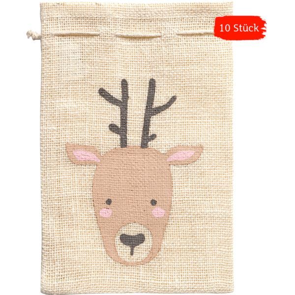 Jutesack Rentier • natur • 17 x 25 cm • mit trendigem Motiv • 10 Stück
