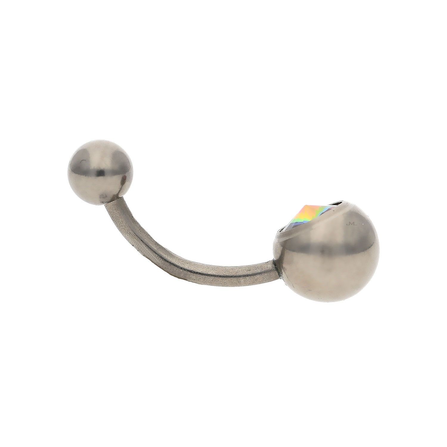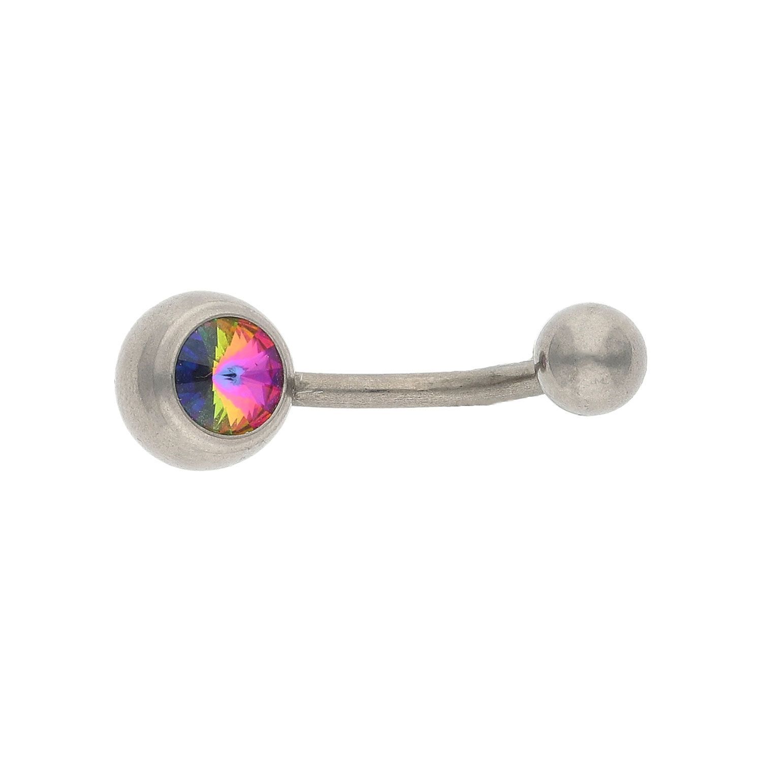 Das klassische Bauchnabelpiercing von JuwelmaLux ist aus Titan hergestellt und ist mit einem rosanen-grünen synthetischen Zirkonia Stein besetzt worden. Die untere Kugel in dem der Zirkonia Stein eingefasst wurde ist fest angebracht, die Schraubkugel ist sozusagen der Verschluss und ist zum Aufdrehe
