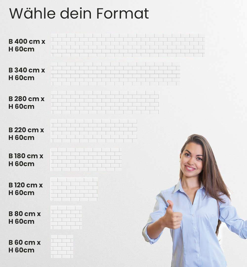 60 x 60cm, 80 x 60cm, 120 x 60cm, 180 x 60cm, 220 x 60cm, 280 x 60cm, 340 x 60cm und 400 x 60cm