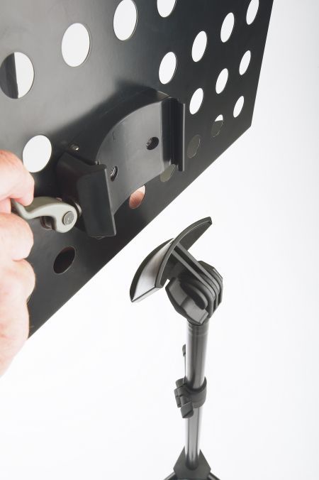 K&M 11940 Orchesternotenpult Pulverbeschichtetes gelochtes Notenpult aus Stahl mit Verbindungselementen aus Kunststoff. Die Notenpultplatte kann mit einem praktischen und bedienerfreundlichen Schnellverschluss einfach und schnell montiert und abgenommen werden. Eine große handliche Flügelmutter erle