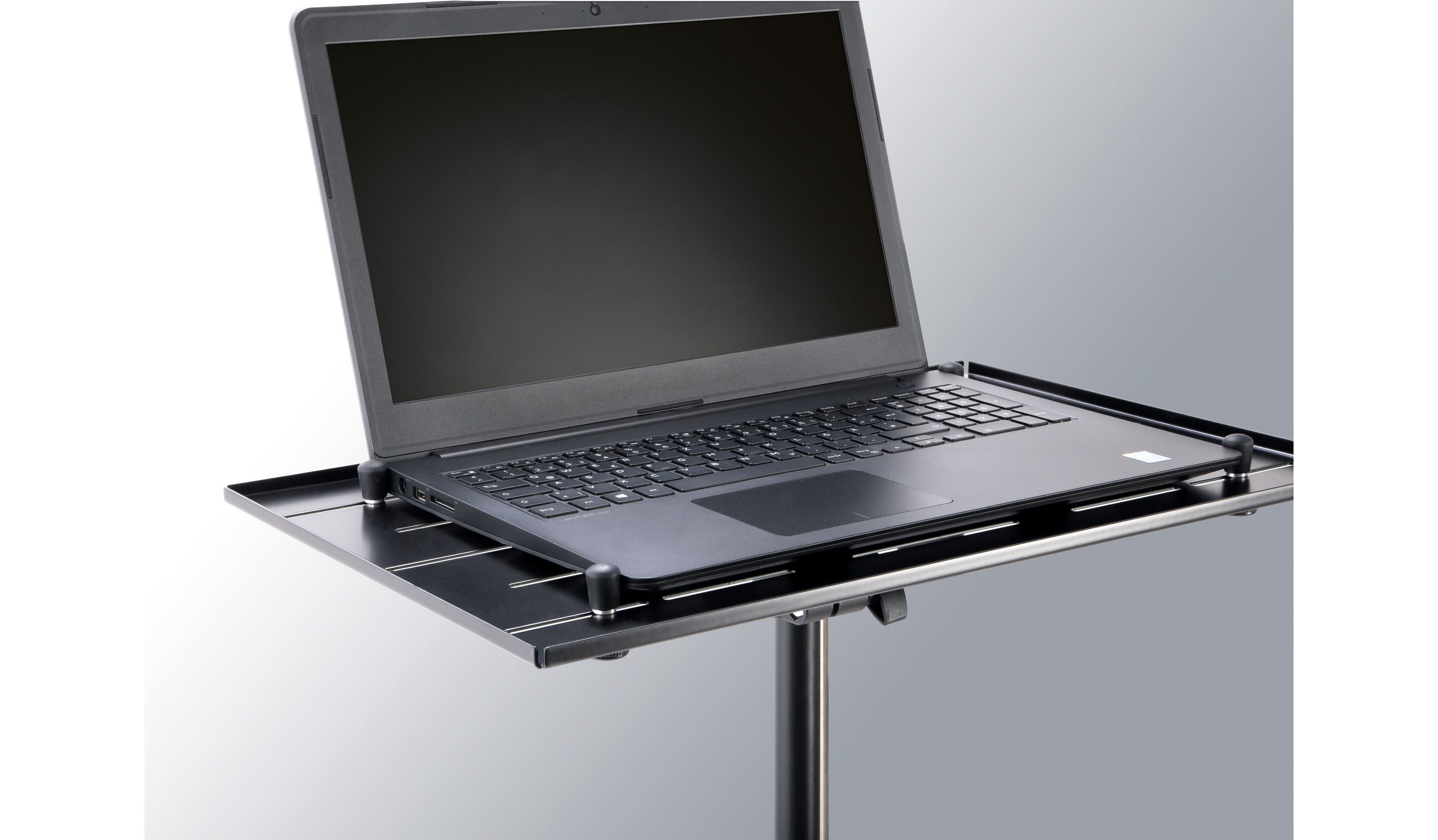 K&M 12185 Laptop-Ständer Dieser Laptopständer steht für Standfestigkeit und Sicherheit. Die großzügig bemessene Auflageplatte bietet Platz für alle gängigen Laptops. Dank der verstellbaren Klemmbolzen mit Gummikappe wird der Laptop sicher und schonend gesichert. Die Klemmbolzen werden hierzu an den