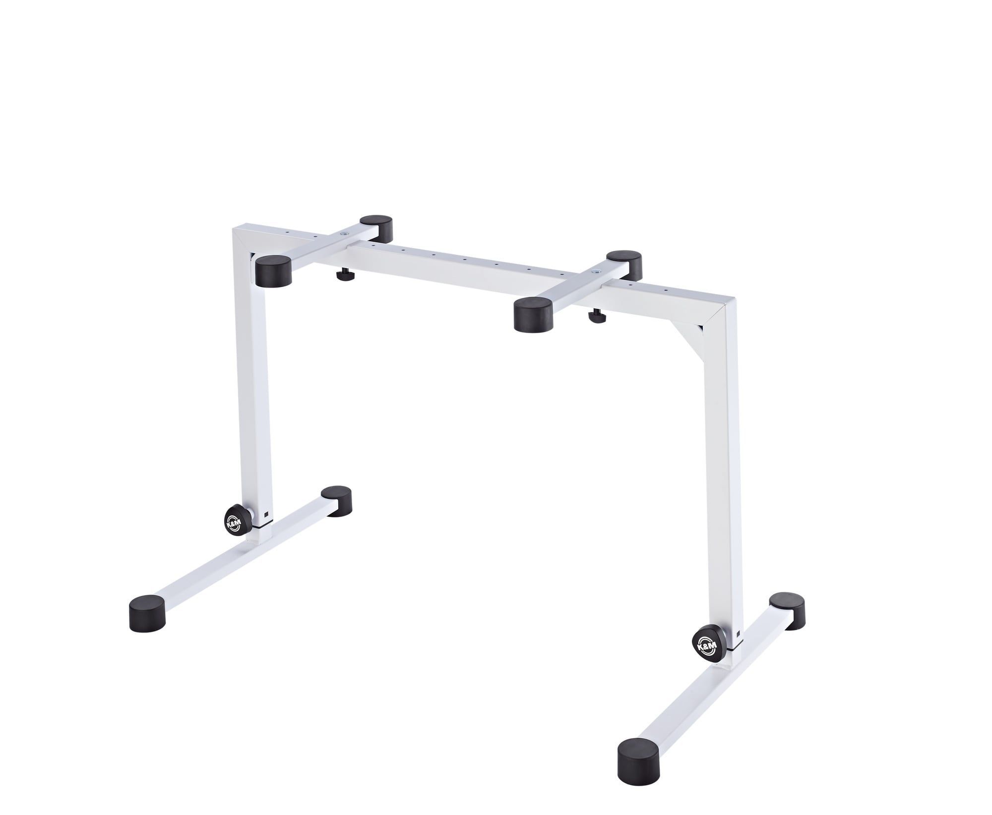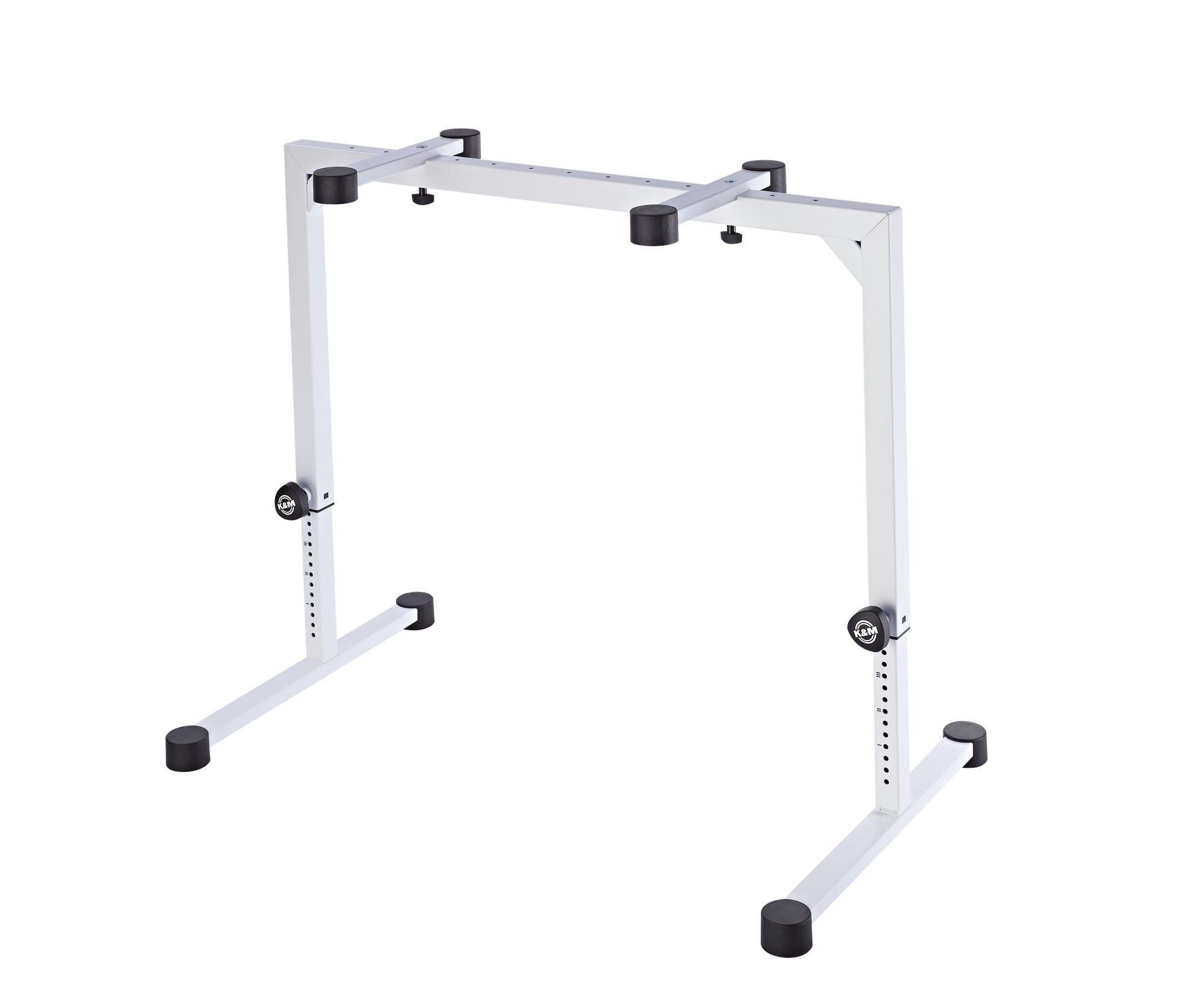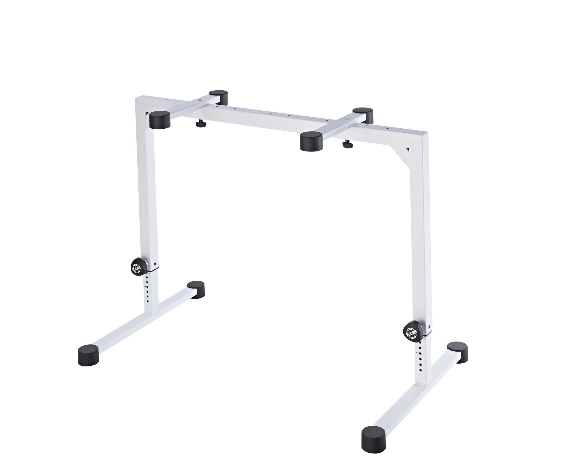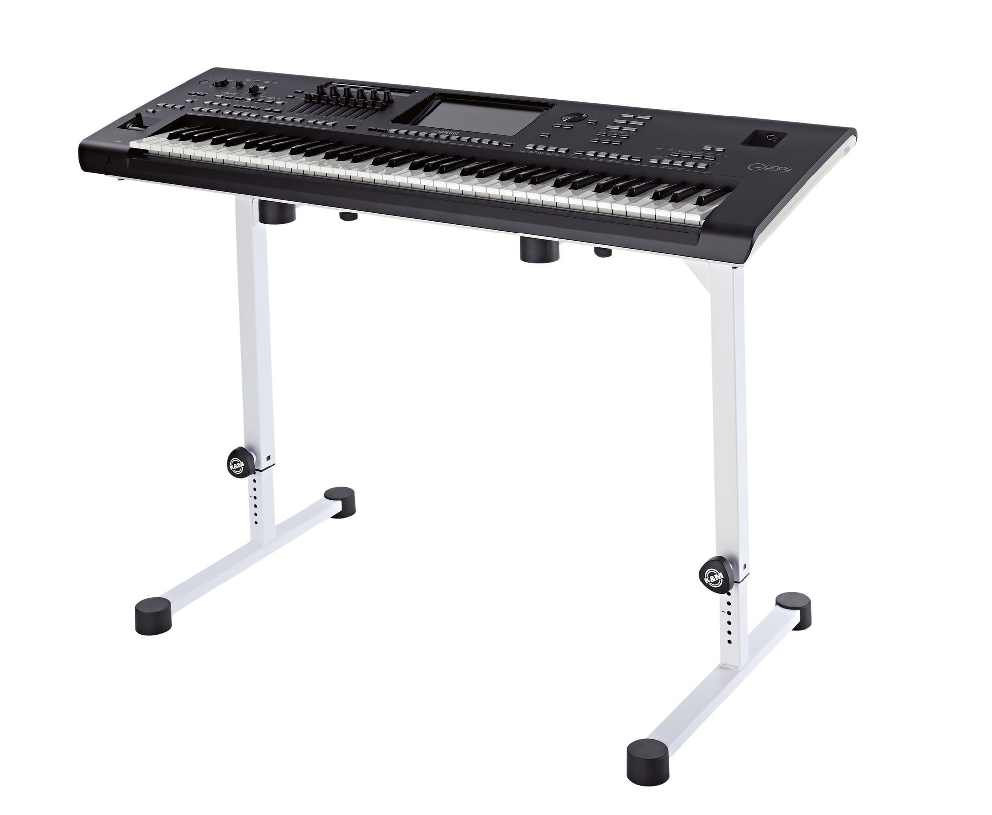 Der K&M 18810 Keyboard-Tisch Keyboardständer Omega Die kompakte Stahlrohrkonstruktion und die großen runden Parkettschoner verleihen diesem formschönen Keyboardtisch deutlich mehr Stabilität. Die beidseitigen Rast-Klemmschrauben ermöglichen eine einfache und feine Höhenverstellung. Die Auflagearme k