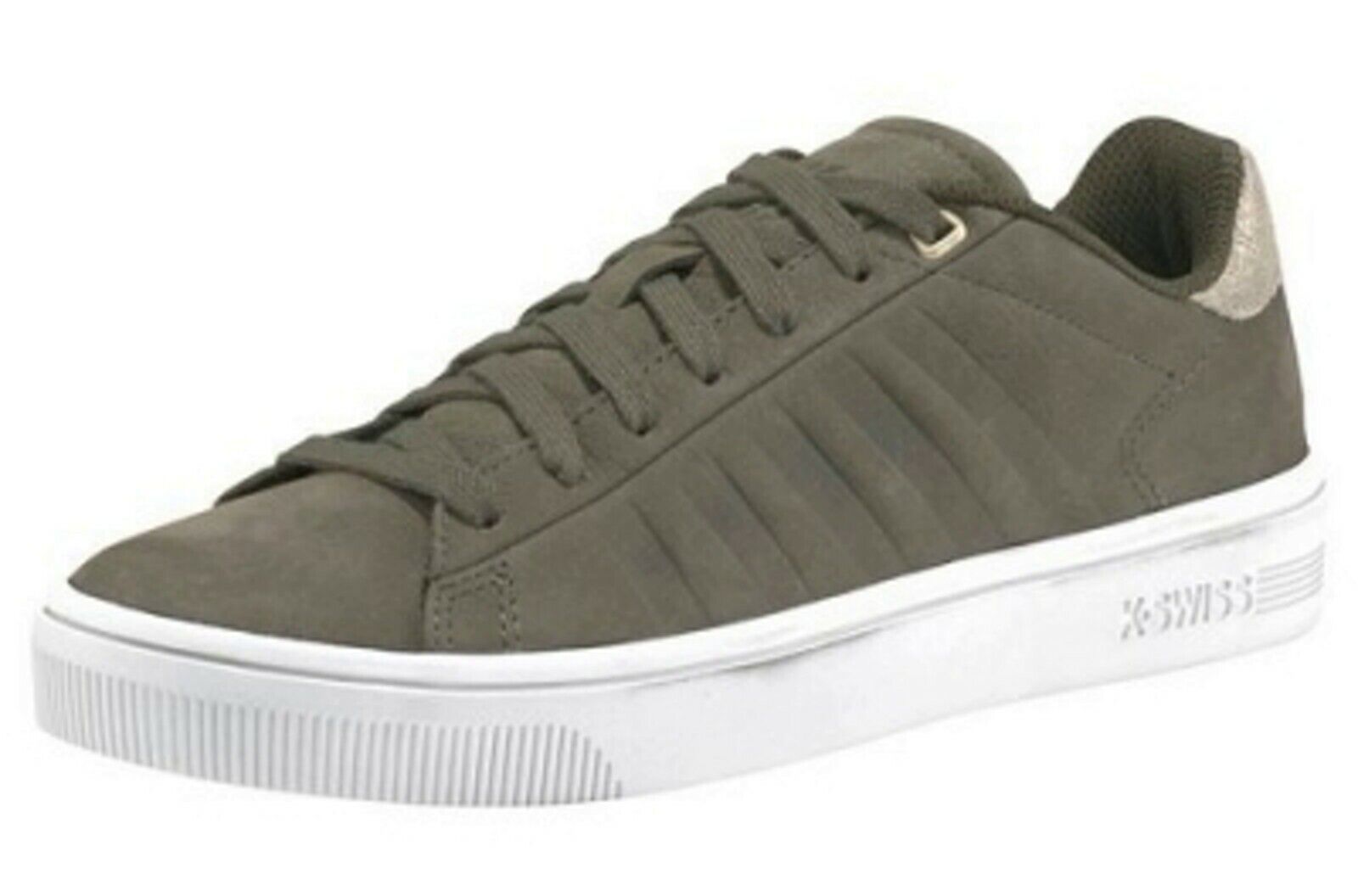 K-Swiss Damen Sneaker Court Frasco NEU NEU - Die Schuhe wurden in einen Neutralen Weißen Karton gepackt. Model: K-Swiss Court Frasco Farbe: Olive Night Hinten Gold mit einer Glizernden Fersenkappe Hochwertiges Obermaterial aus Leder Strapazierfähige abriebfeste Laufsohle Sehr guter Tragecomfort Abme