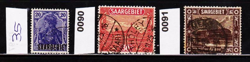 K105 - Deutsche Abstimmungsgebiete - Saargebiet - Mi. Nr. 35 + 90 + 91 o aus Jahrgang 1920 und 1922 - Erhaltung o gestempelt Zuordnungen nach A oder, x oder y usw. erfolgen evtl. nicht, wenn meine Kenntnisse für eine sichere Beurteilung nicht ausreichen. Insofern können u.U. auch Abarten und Platten