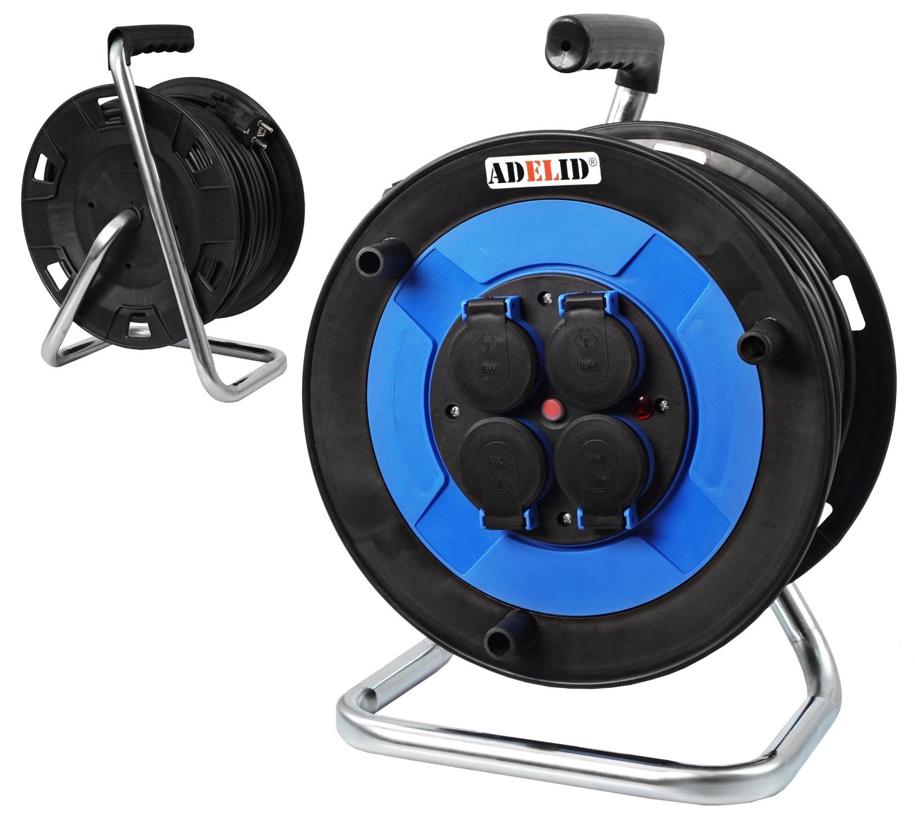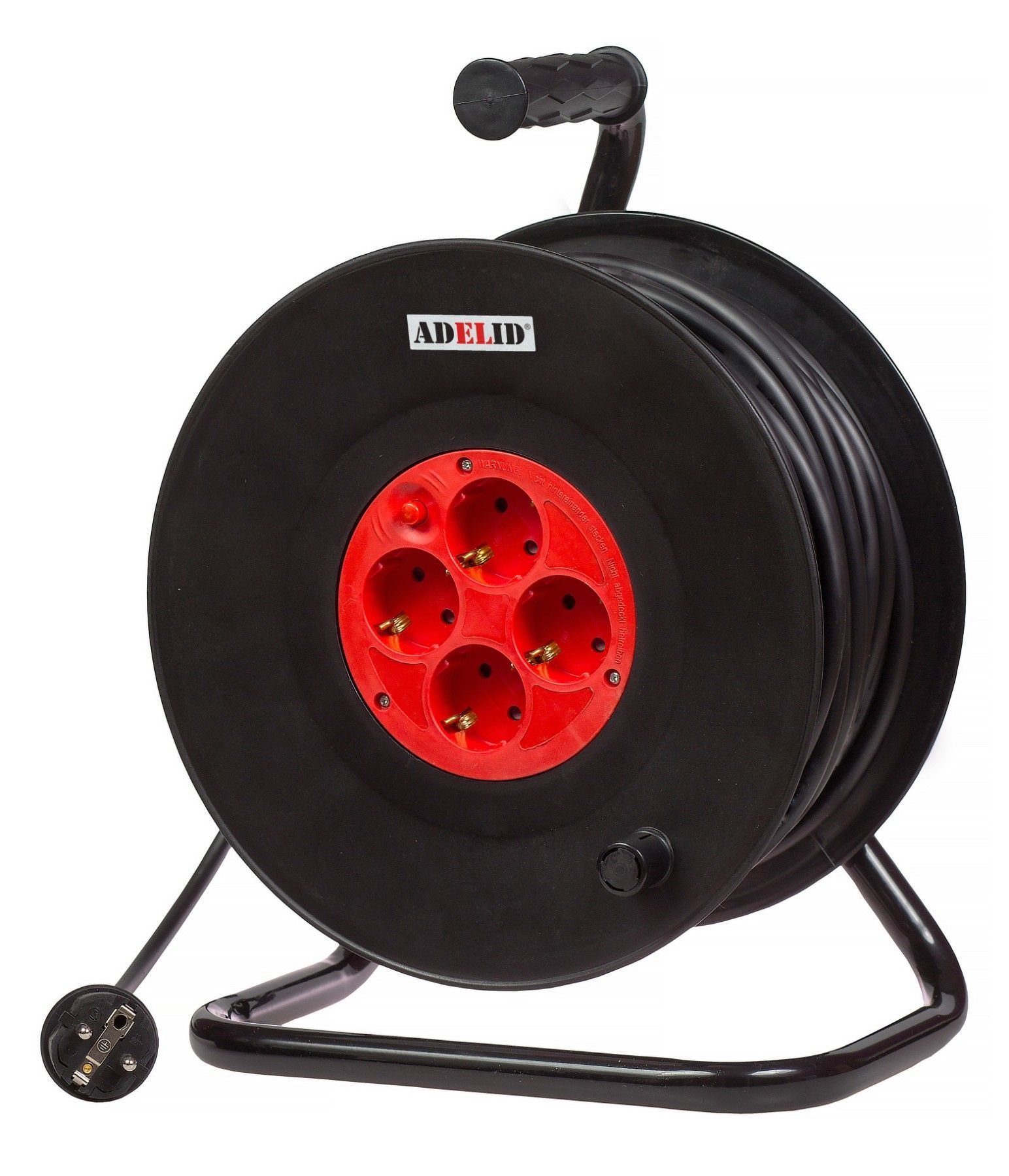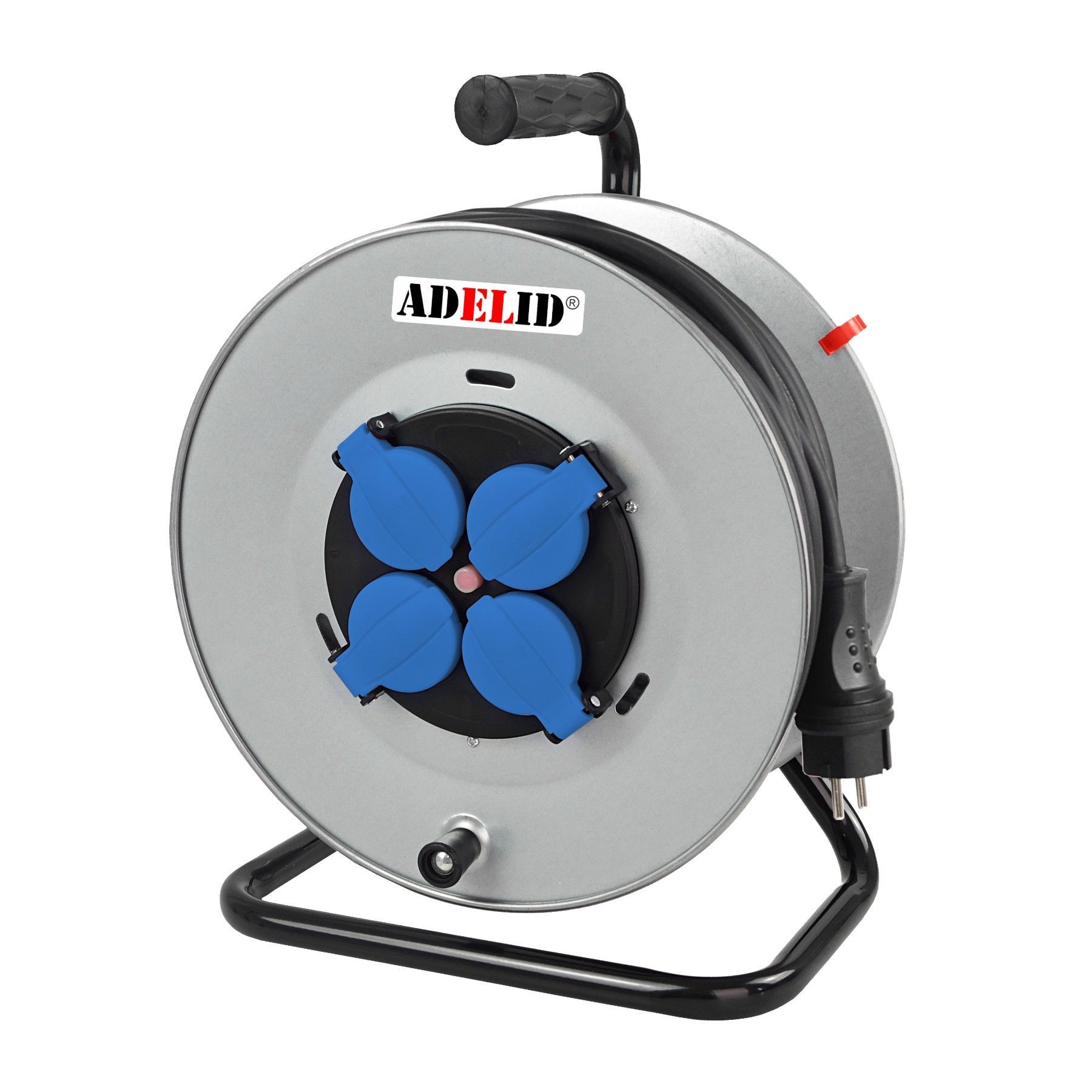 Trommel-Verlängerungskabel mit 4 Steckdosen 16A 2P+PE 230V, PVC-Kabel H05VV-F 3*1,5mm². Es gewährleistet den sicheren und ordnungsgemäßen Betrieb elektrischer Geräte. Zum Anschluss aller elektrischen Geräte, z.B. Rasenmäher, Elektrowerkzeuge, Staubsauger, Gartengeräte usw. Es besteht aus einem