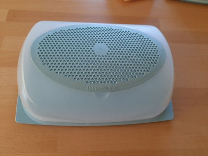 Ich biete hier diesen Käse-Max von Tupperware. Er wurde selten benutzt, auf der Platte sind ein paar sehr leichte Schnittspuren zu sehen, die aber den Behälter natürlich überhaupt nicht beeinträchtigen, möchte es nur erwähnt haben. Insgesamt guter Zustand. Danke fürs Anschauen, hab noch mehr eingest