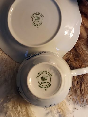 Zum Verkauf steht ein Kaffeegedeck bestehend aus 1 Tasse und 1 passender Untertasse aus dem klassischen Kahla Zwiebelmuster. Euro Details: Hersteller: Kahla Porzellan Dekor: Zwiebelmuster (blau) Herkunft: DDR Zeitraum: ca. 1970er–1980er Jahre Bodenstempel: original Kahla-Stempel (gleicher Stempel be