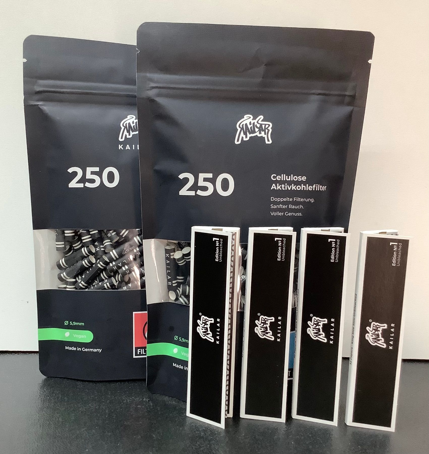 Kailar 2 Beutel - Cellulose Slim Aktivkohlefilter ø 6mm - 500 St. schw + 4x Blättchen
