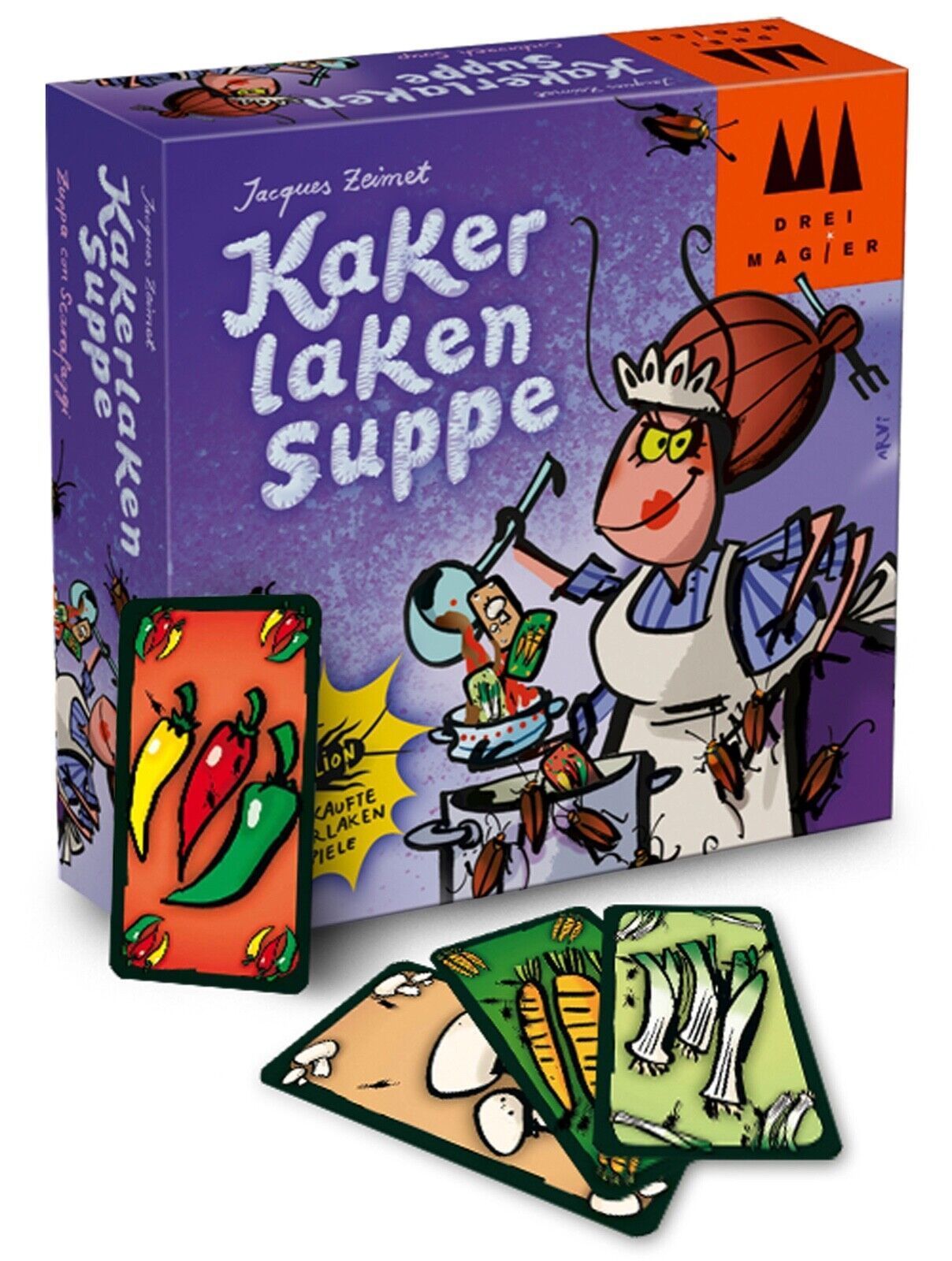 Spieleranzahl: 2 bis 6 Spieldauer: 15 Minuten Altersempfehlung: 6+ Drei Magier®: Kakerlakensuppe Die Spieler kochen möglichst schnell eine Suppe, indem sie abwech- selnd ihre Gemüsekarten ablegen. Genauso schnell wie sie die Karten ausspielen, müssen sie das entsprechende Gemüse auch schnell und „ri