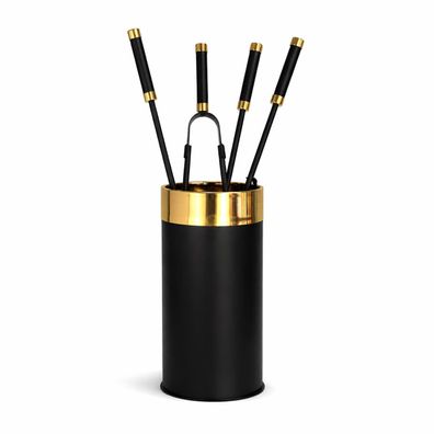 • Kaminbesteck modern Schwarz Messing mit Standbehälter - Kamingarnitur 5-teilig