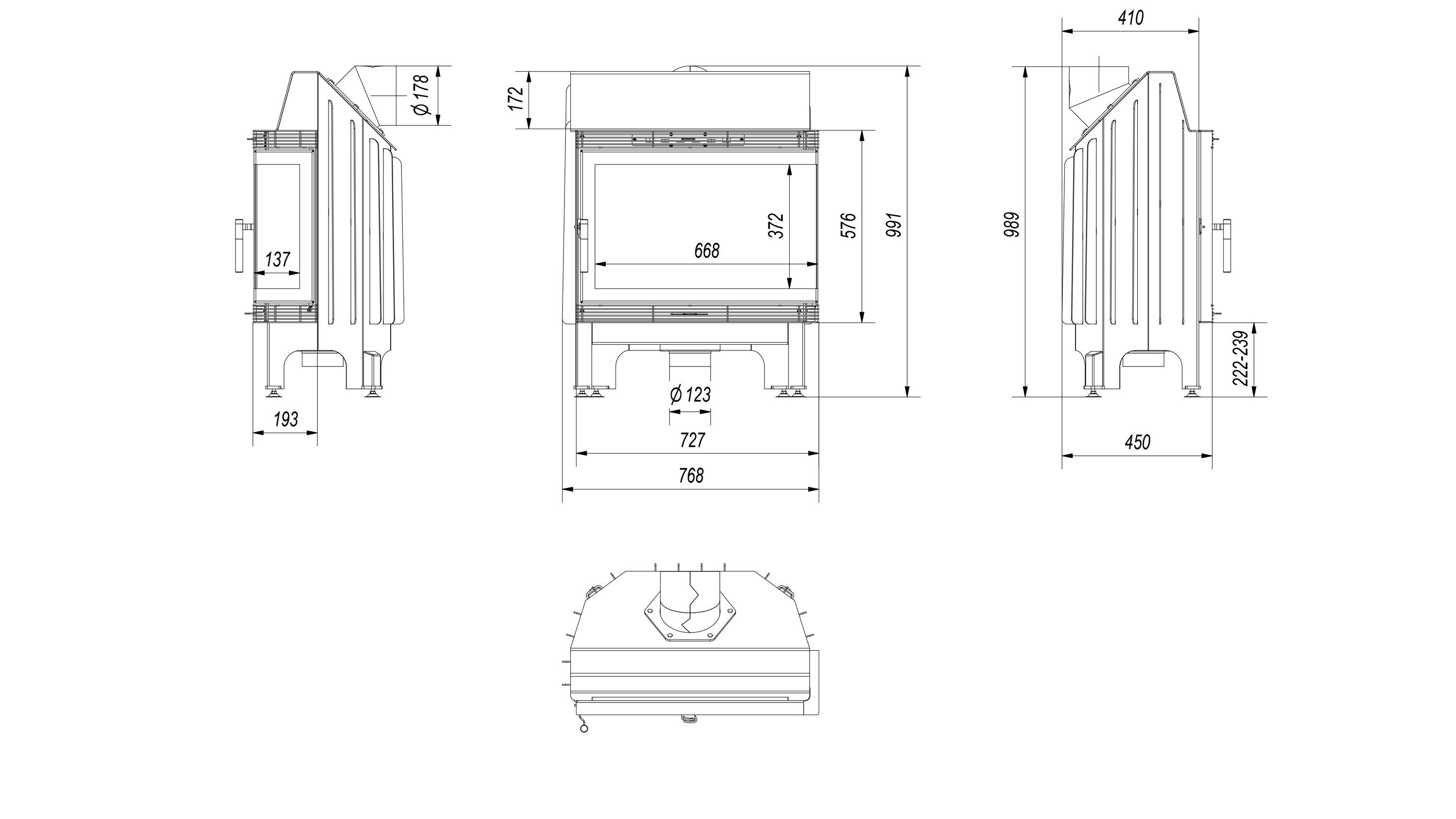Kamineinsatz aus Stahl KRATKI BLANKA rechts 11 kW Ø 180