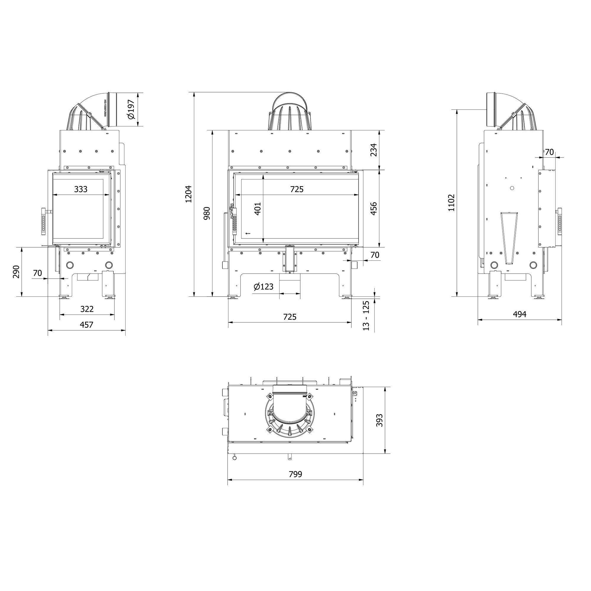Kamineinsatz aus Stahl KRATKI FLOKI M rechts 10 kW Ø 200
