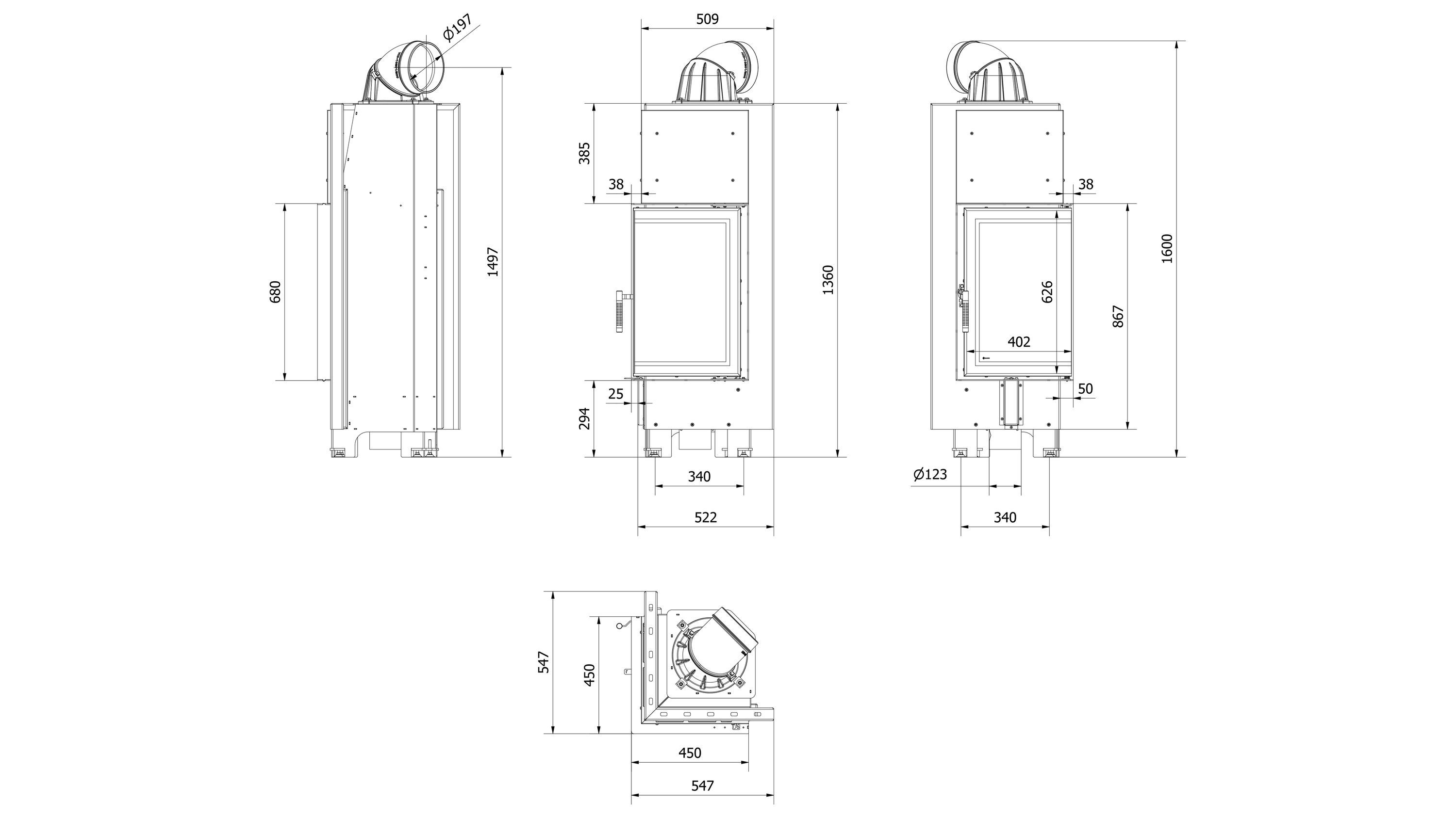 Kamineinsatz aus Stahl KRATKI MBN links 10 kW Ø 200 schwarz Verkleidung