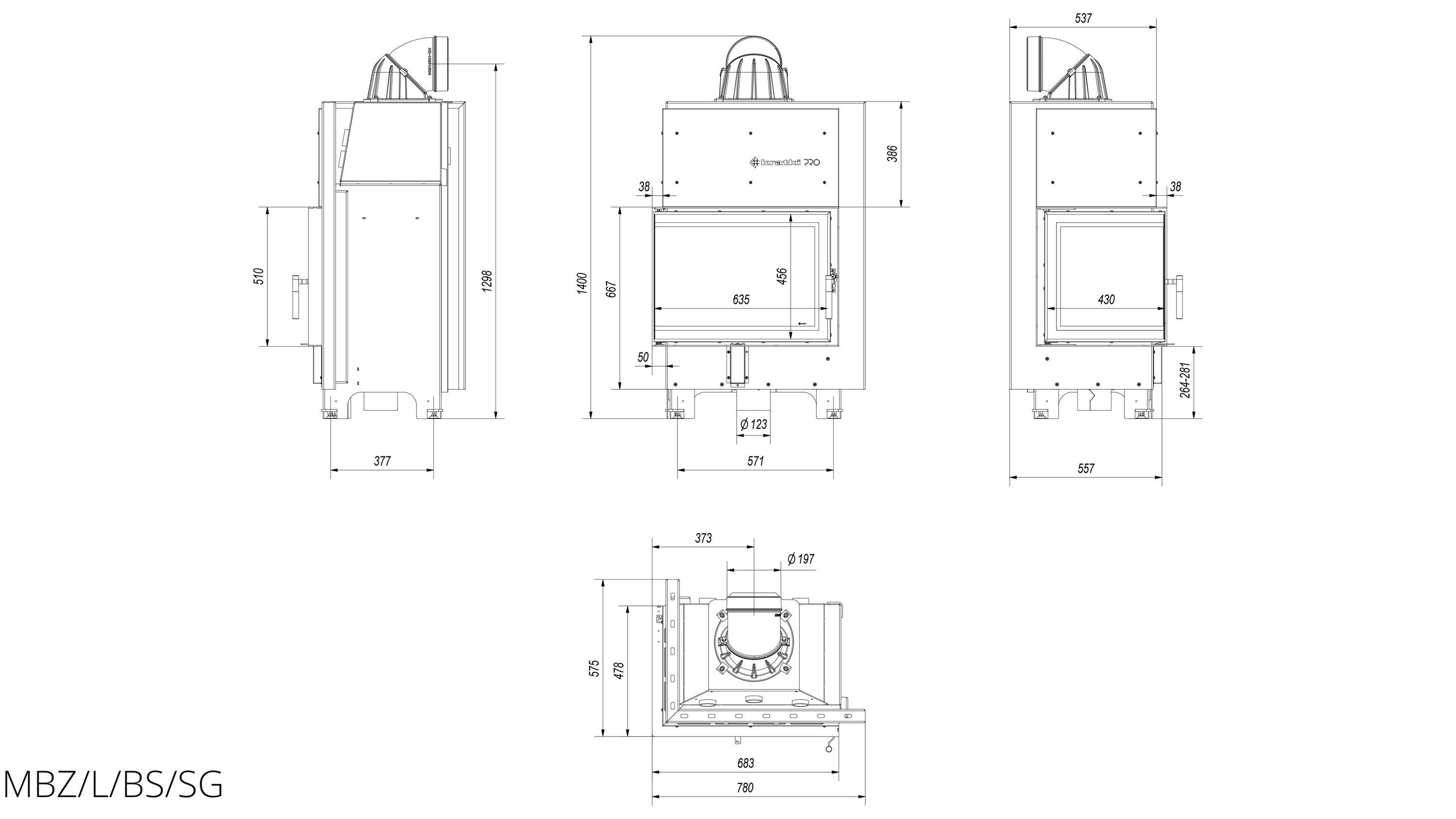 Kamineinsatz aus Stahl KRATKI MBZ links 13 kW Ø 200 gebogenes Glas