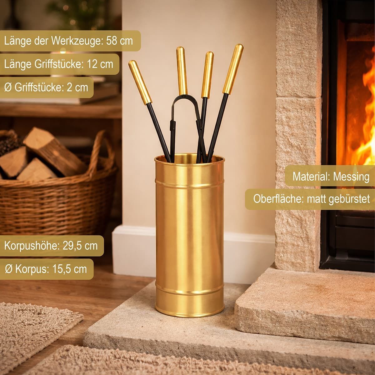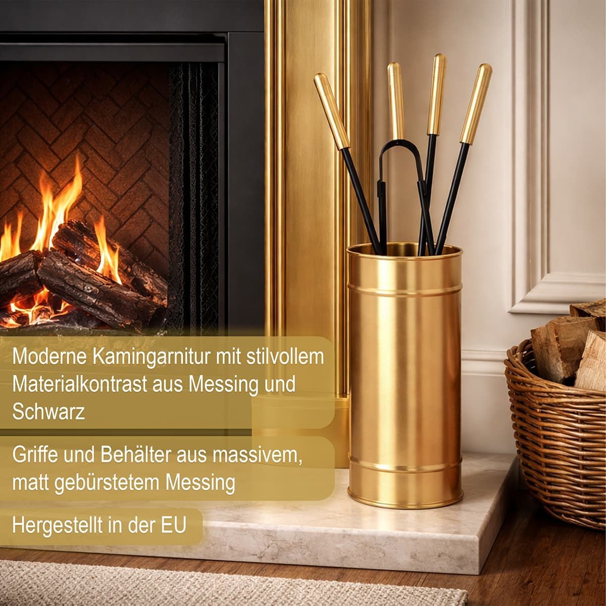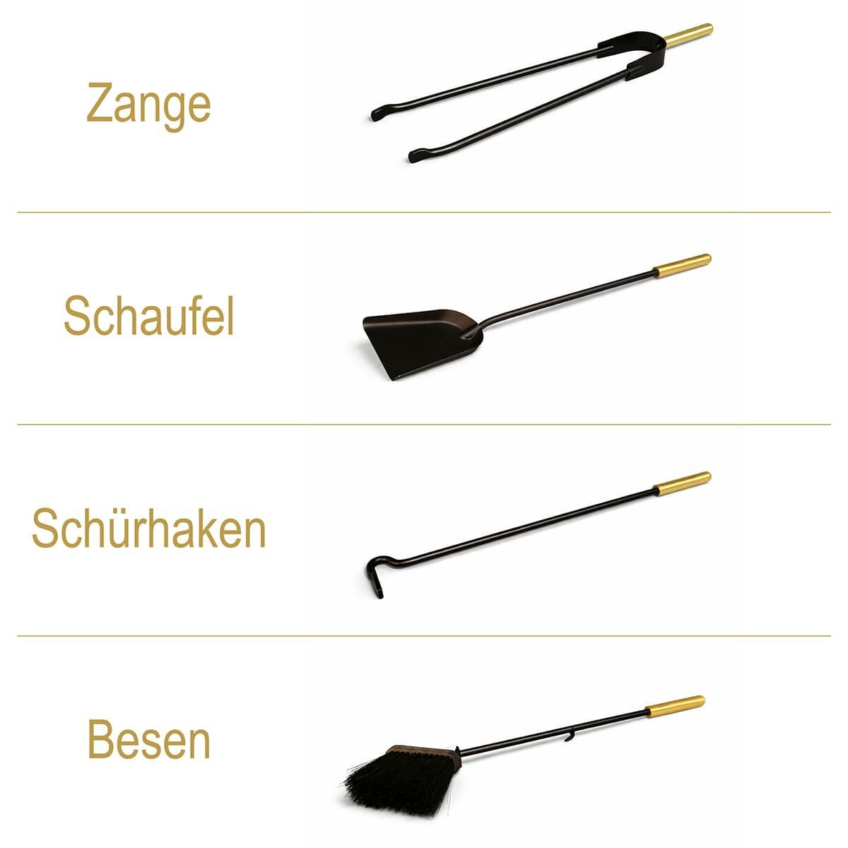 Kamingarnitur stilvoll Messing matt gebürstet - Kaminbesteck Ofenbesteck Schwarz