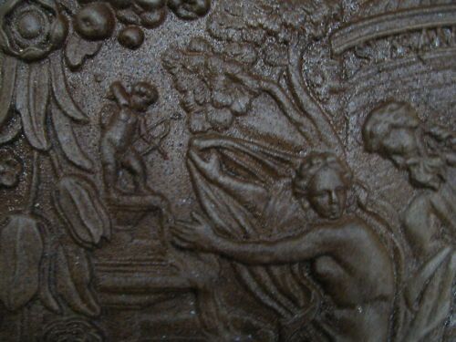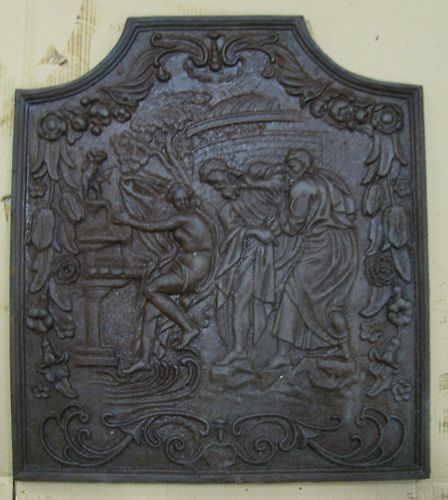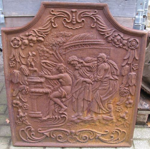 Sie kaufen hier eine Kaminplatte mit einem besonders schönem eingearbeitetem Relief. Zu sehen ist eine Szene aus der Antike. Diese schöne Platte ist wunderschön und reichhaltig verziert mit Pflanzen und Blüten. Diese Kunstgussarbeit ist 74cm breit und 82 cm hoch und bringt ca.60kg Gewicht auf die Wa