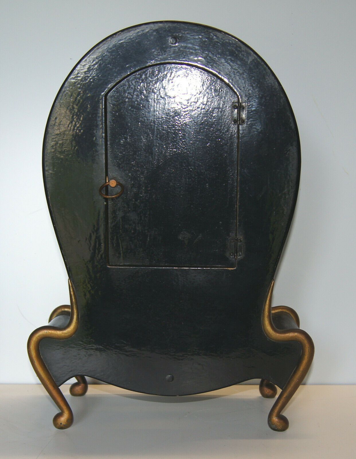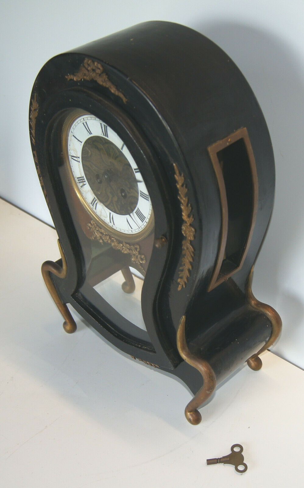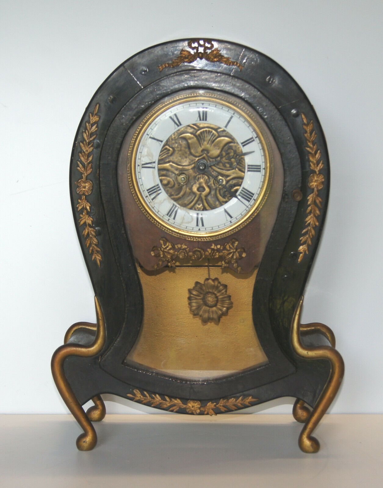 Kaminuhr um 1860. Holzgehäuse, original schwarz lackiert mit Messing-Applikationen. Herkunft: wohl Frankreich. Uhrwerk mit Schlagglocke. Schlüssel vorhanden. Maße: H 42, B 30, T 14 cm. Schwungfeder zum Pendel fehlt, Zifferblatt geklebt! Sonst gut erhalten. Antikes am Deich - Inh: Oliver Kipp-Trense