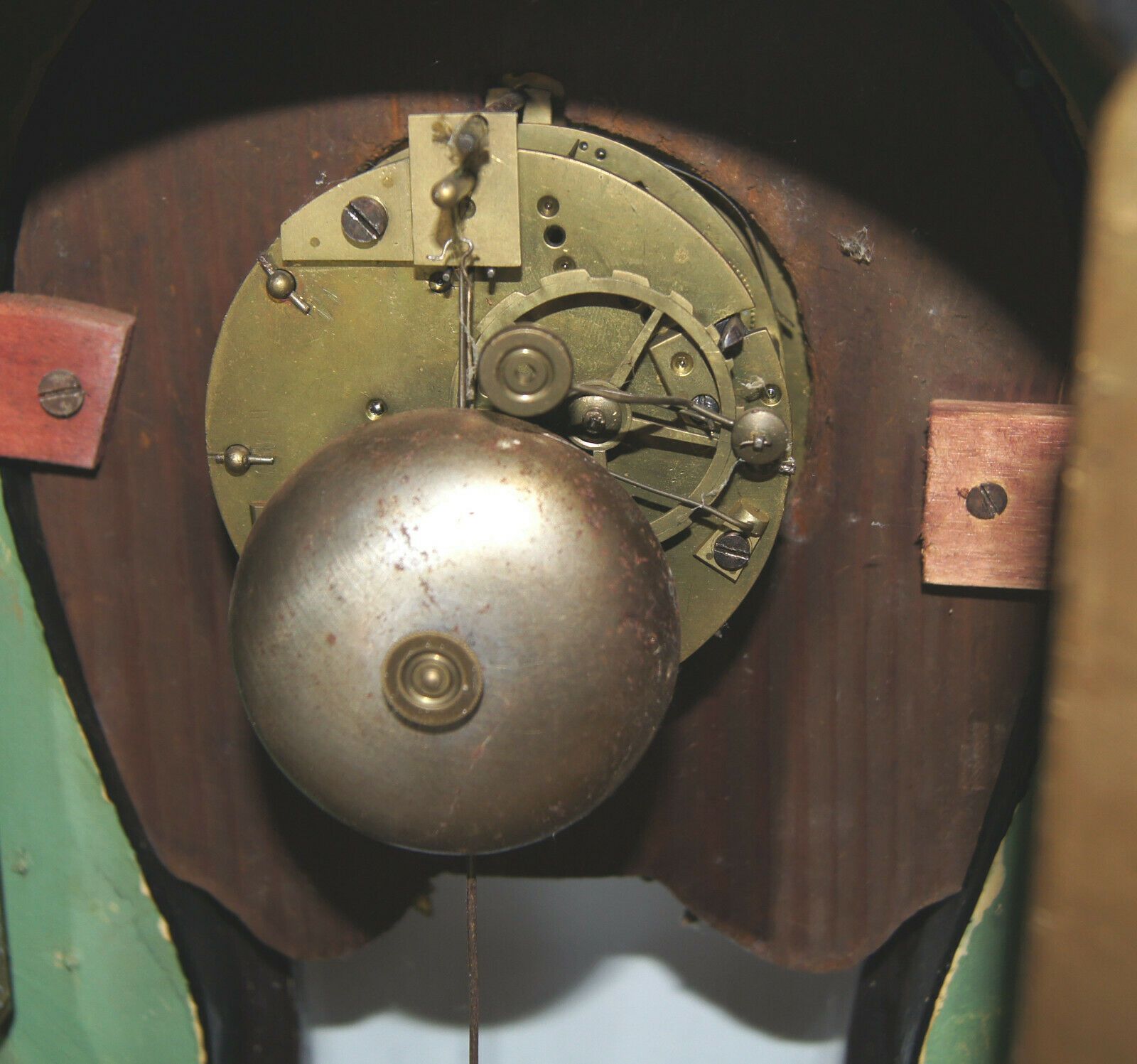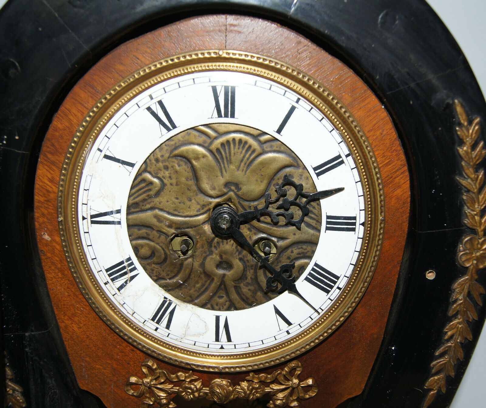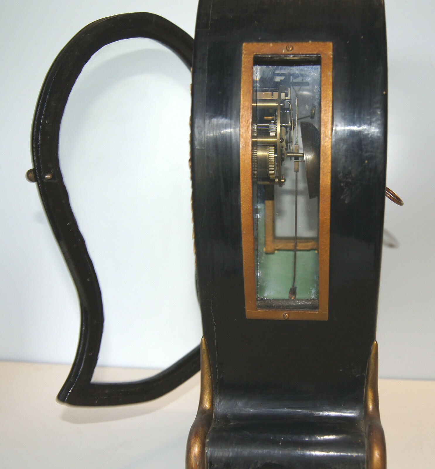 Kaminuhr um 1860. Holzgehäuse, original schwarz lackiert mit Messing-Applikationen. Herkunft: wohl Frankreich. Uhrwerk mit Schlagglocke. Schlüssel vorhanden. Maße: H 42, B 30, T 14 cm. Schwungfeder zum Pendel fehlt, Zifferblatt geklebt! Sonst gut erhalten. Antikes am Deich - Inh: Oliver Kipp-Trense