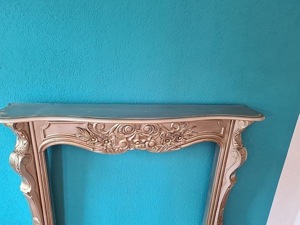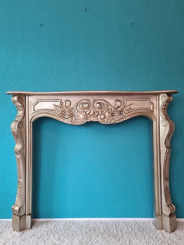 Kaminumrandung mit dekorativer Verzierung und schöner Schnitzereien im Antik-Stil gehalten. Die Kaminverkleidung wurde aus Mahagoni-Holz hergestellt, und ist im silbernen Farbton gehalten. Gesamthöhe ca. 138 cm Gesamtbreite ca. 166 cm Gesamttiefe ca. 28 cm Innenhöhe ca. 105 cm Innenbreite ca. 123 cm