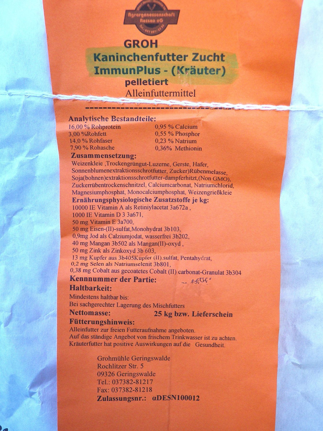 Andere Mengen erhalten Sie im Shop. Alleinfuttermittel für Zuchtkaninchen ImmunPLus ( Kräuter) Pelletiert ca. 3 mm. Zusammensetzung : Gerste, Hafer , Weizenkleie, Trockengrüngut-Luzerne, Zuckerrübenmelasseschnitzel, Sonnenblumenextraktionsschrot, Sojaextraktionsschrot Non-GMO, Zuckerrübenmelasse, Ca