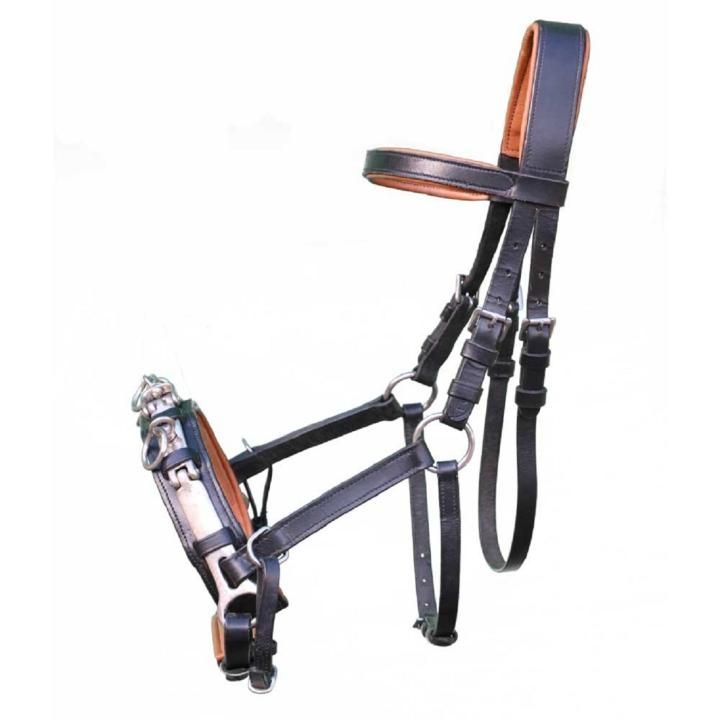 Der Pferde KAPPZAUM aus unserem eigenen Hause BRAMA-WEST besteht aus hochwertig verarbeitetem schwarzem Leder und ist im Nasen-und Nackenbereich mit hellbraunem Leder unterlegt. Über den mittig auf dem Nasenriemen platzierten Ring des Kappzaums wirken Impulse sehr präzise auf Nase und Genick, sodass