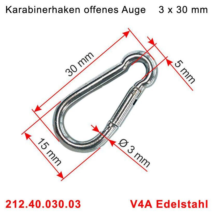 Artikel: Karabinerhaken Ausführung: Industriequalität ähnlich DIN 5299 Form C offenes Auge glänzend poliert rostfrei Material: V4A Edelstahl stainless steel AISI 316 Karabinerhaken offenes Auge 3 x 30 mm 212.40.030.03 V4A Edelstahl Karabinerhaken offenes Auge 4 x 40 mm 212.40.040.04 V4A Edelstahl Ka