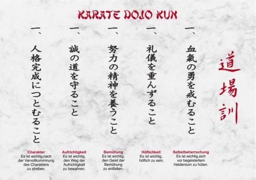 Mit den 5 Karate Werten in japanischen Schriftzeichen und deutscher Bedeutung: Charakter Aufrichtigkeit Bemühung Höflichkeit Selbstbeherrschung